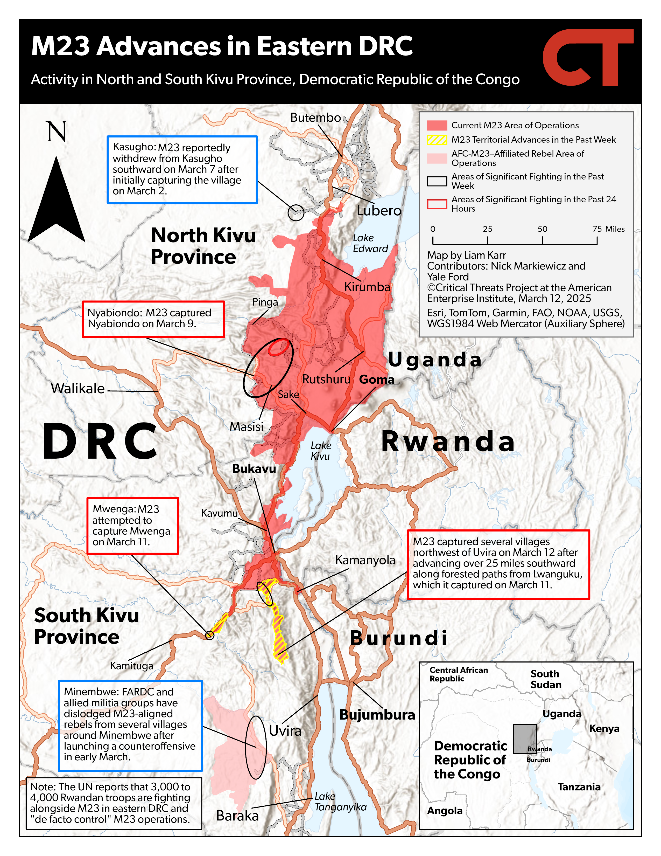Several armed militia groups in North Kivu reportedly defected from the FARDC to join M23’s broader coalition, which will likely boost M23’s ongoing offensive in northern North Kivu. Congolese media initially reported that fighters from three armed groups created a new coalition and joined the AFC on March 9.[120] Some leadership figures and a small number of elements from two of the groups immediately denounced defections from their groups and denied their involvement with M23, however.[121] The UN has assessed that AFC’s strategy to recruit and build a wider coalition of armed groups is “key” to M23’s “successful territorial expansion” within its broader effort to “reshape the political and military landscape” of the eastern DRC.[122] M23 has advanced in northern Lubero district toward the Lubero district capital since late February but has faced significant resistance from FARDC and Wazalendo fighters.[123] M23 has attempted to flank Lubero town, but pro-Congolese government forces blocked the group’s advance, leading M23 to divert northwest toward the gold-mining town of Bunyatenge.[124]