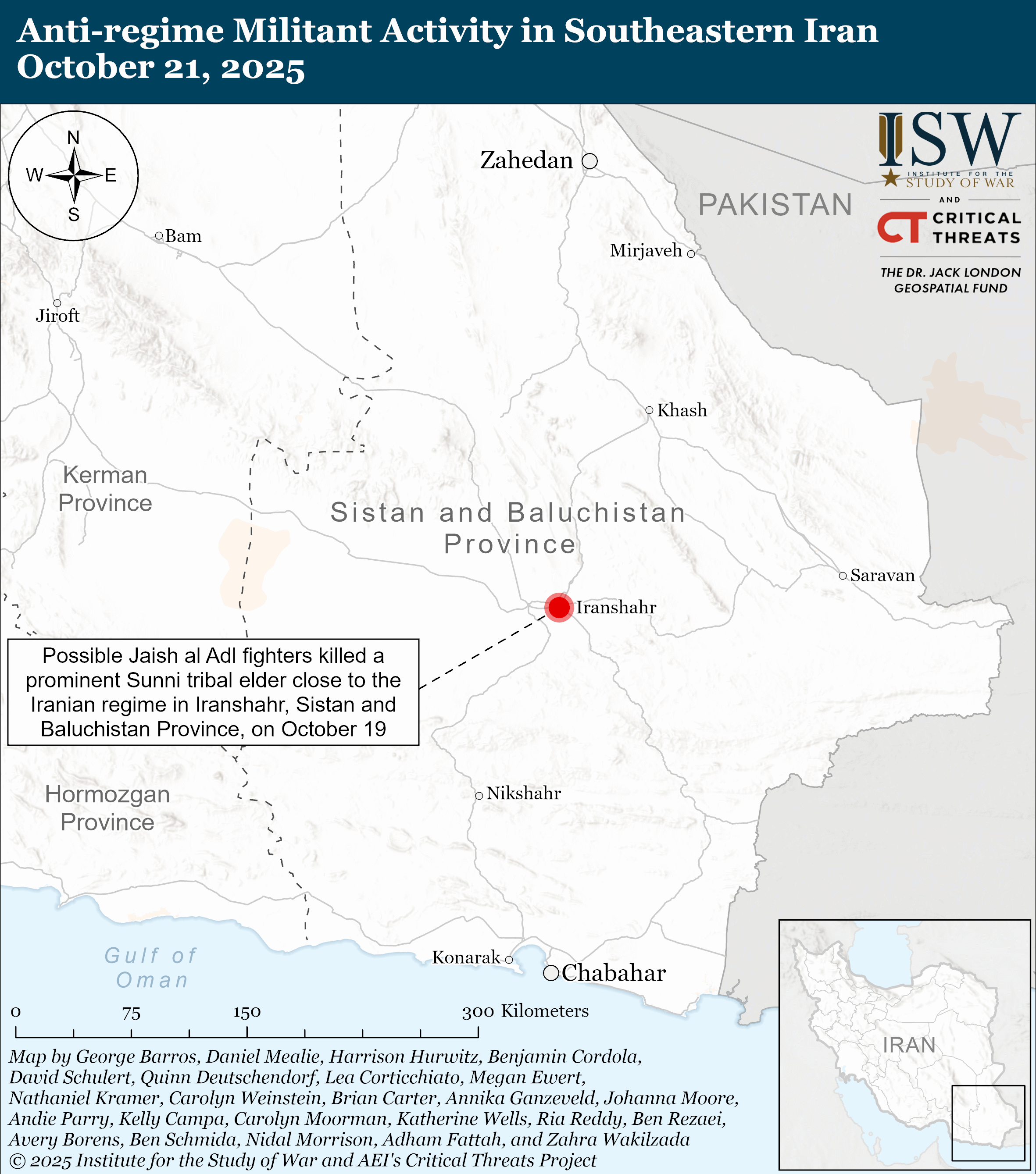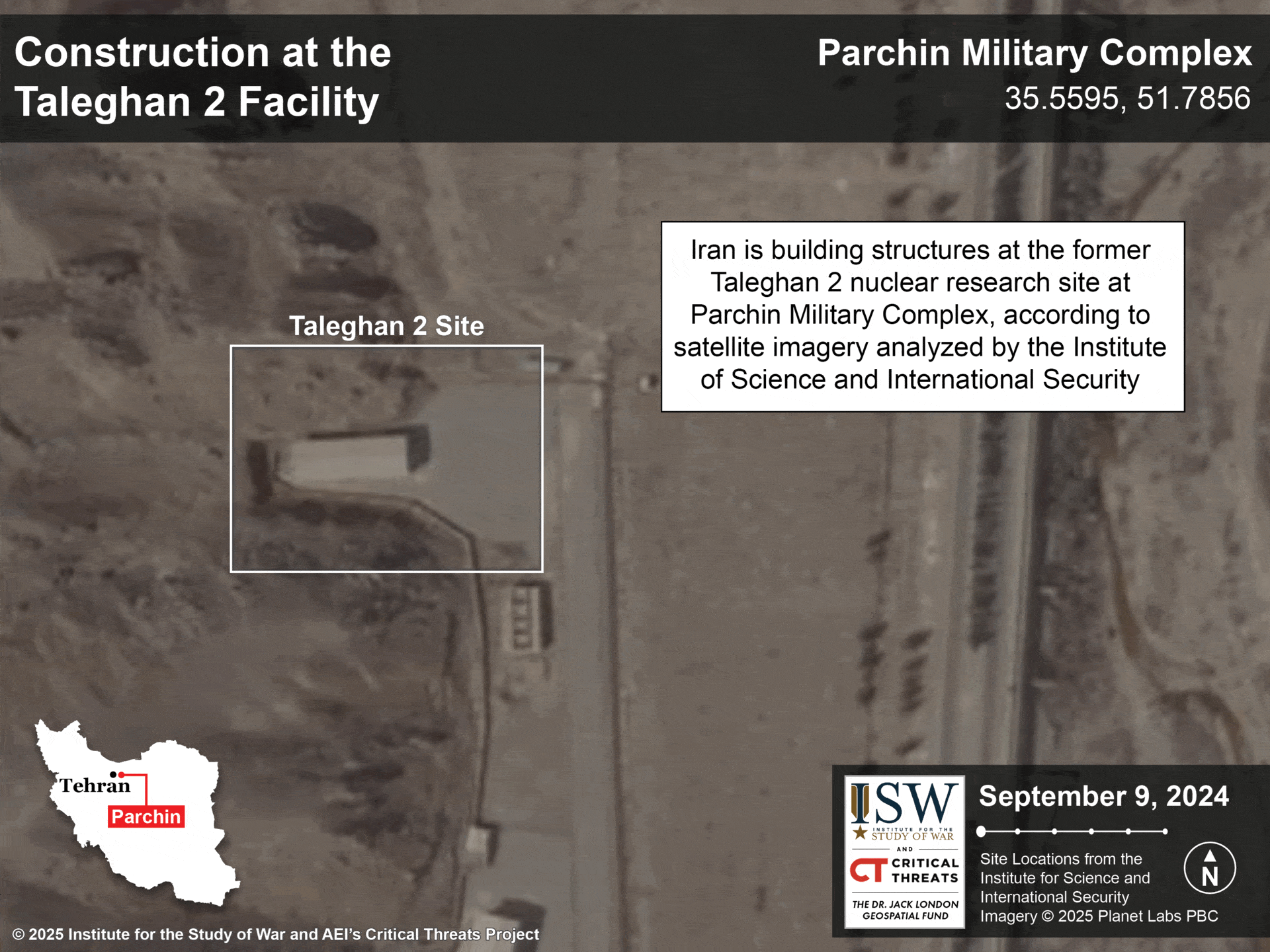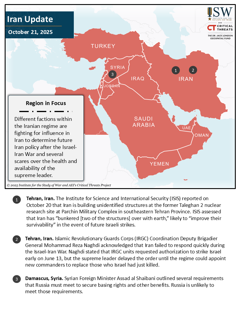 - Iranian Nuclear Program Reconstitution: The Institute for Science and International Security (ISIS) reported on October 20 that Iran is building unidentified structures at the former Taleghan 2 nuclear research site at Parchin Military Complex in southeastern Tehran Province. ISIS assessed that Iran has ”bunkered [two of the structures] over with earth,” likely to “improve their survivability” in the event of future Israeli strikes.