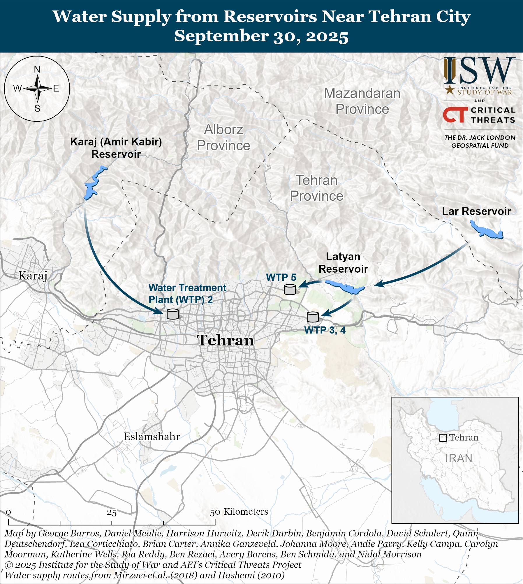 - Iranian Water and Energy Crisis: Iran’s worsening water and energy crisis could gradually increase the Iranian public’s frustrations with the regime and compound existing challenges to regime legitimacy. The Karaj Dam’s water reserves decreased from 111 million cubic meters to 28 million cubic meters between September 2024 and September 2025, making the dam incapable of generating electricity for Tehran.