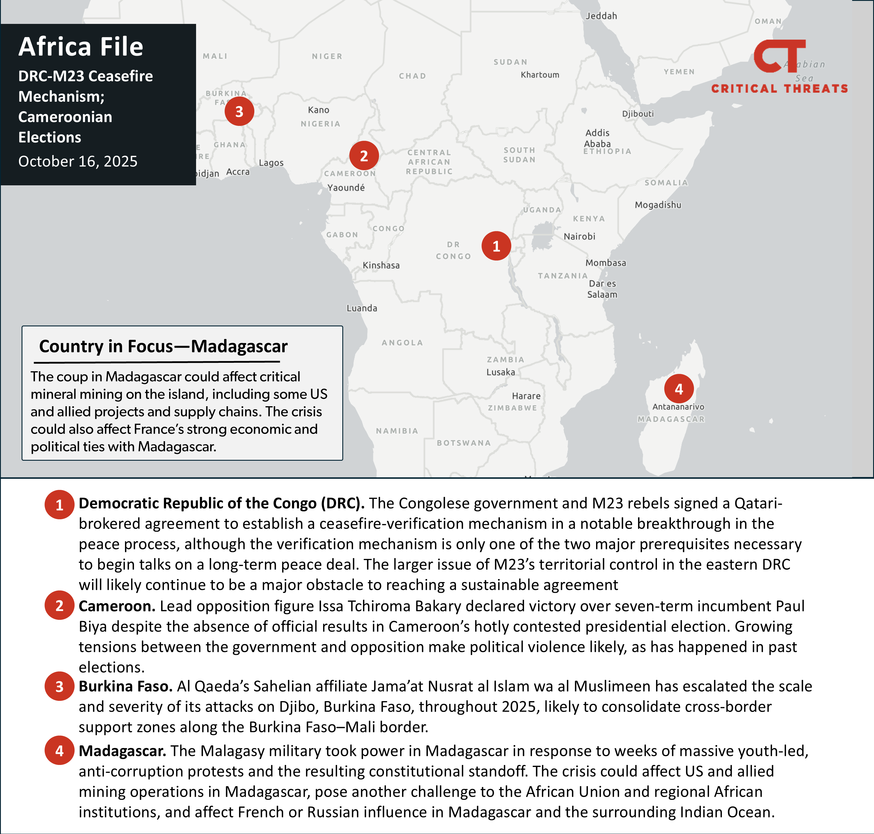 DRC-M23 Ceasefire Mechanism; Cameroonian Elections: Africa File, October 16, 2025