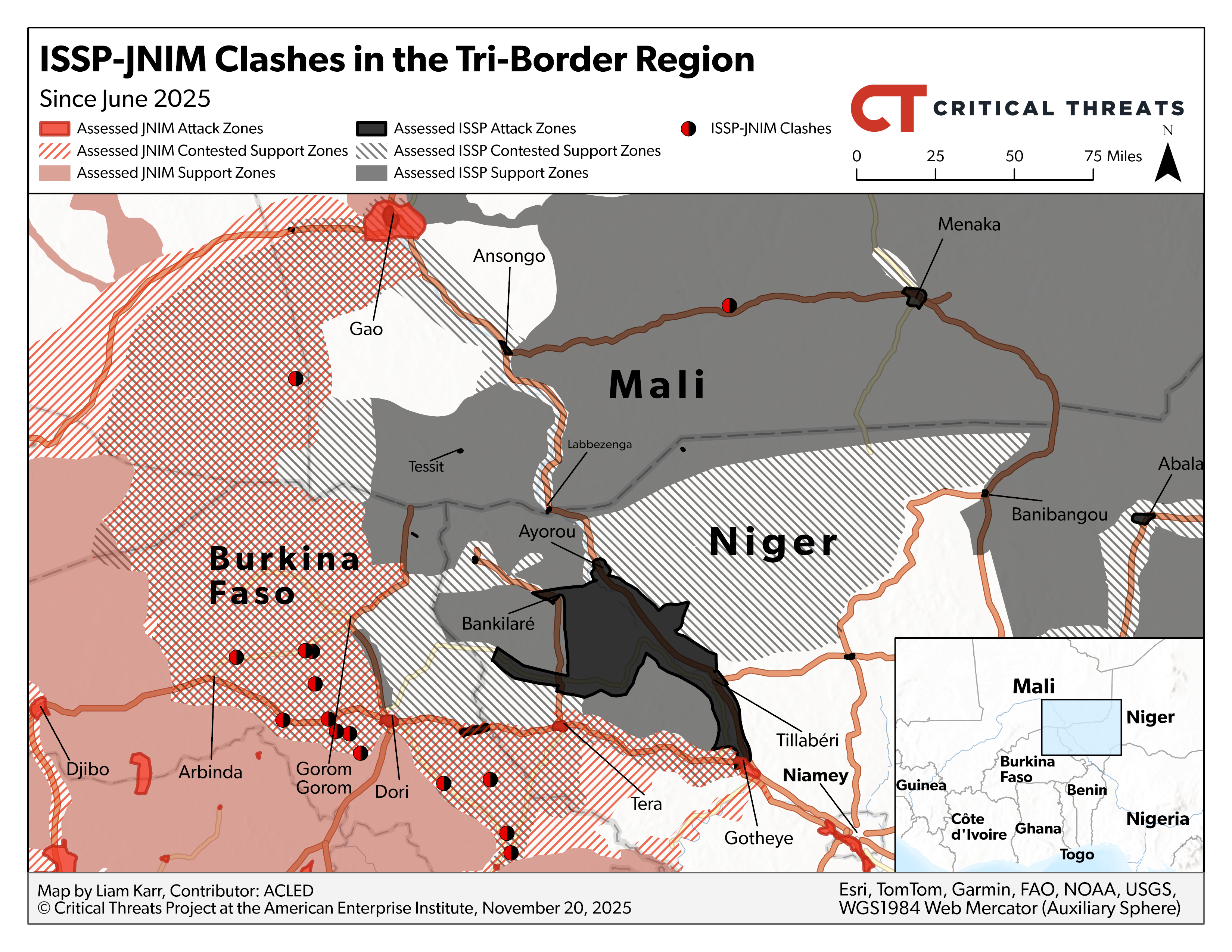 - Tri-Border. Islamic State Sahel Province (ISSP) and Jama’at Nusrat al Islam wa al Muslimeen (JNIM) have engaged in the deadliest period of inter-jihadi fighting since 2022. ISSP may have launched its latest offensive to bolster its legitimacy and status vis-à-vis JNIM following JNIM’s monthslong blockade on Mali’s capital.
