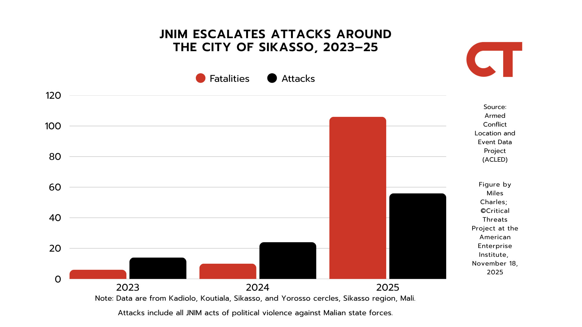 JNIM has sustained an ongoing campaign to isolate Sikasso city. The group has drastically escalated the scale, rate, and severity of its attacks in eastern Sikasso region since the second half of 2025. JNIM has attacked security forces in the Kadiolo, Koutiala, Sikasso, and Yorosso cercles, which surround Sikasso city, twice as many times in the second half of 2025 than in 2023 and 2024 combined and inflicted nearly six times as many fatalities.[114] The group has conducted 80 percent of these attacks in the second half of 2025.[115]