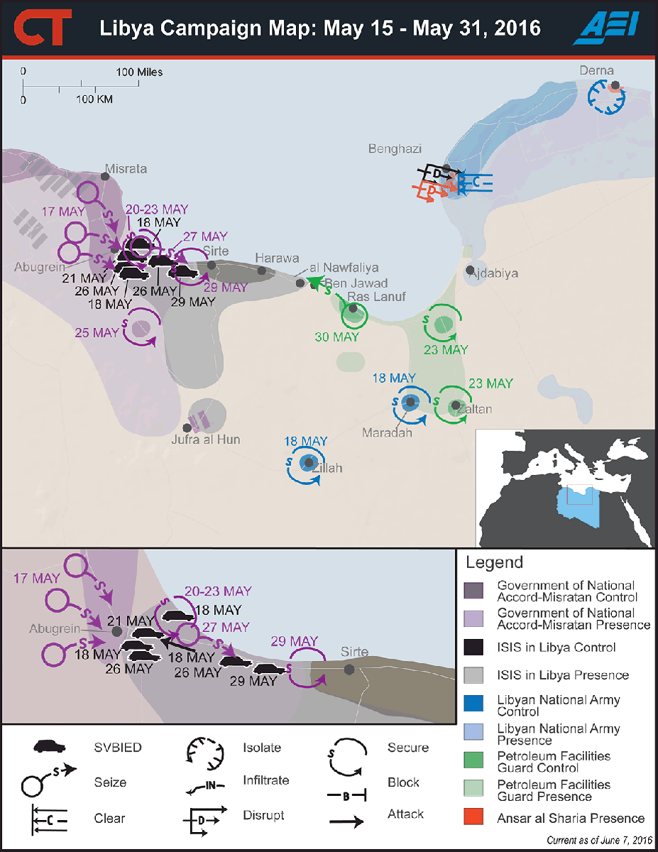 Misratan militias advanced past the positions that they held before ISIS’s May 5 counter-offensive. The militias, augmented by small numbers of American and British special operations forces, used air power and other specialized capabilities to neutralize most of ISIS’s SVBIED attacks on the frontlines, as well as to clear the explosives retreating ISIS militants planted in their wake.[16] The Misratans reach the western outskirts of Sirte city on May 29. The Petroleum Facilities Guard (PFG), a militia force based in eastern Libya that also supports the GNA, mobilized on May 31 and seized the easternmost ISIS-held town, Ben Jawad.[17] Both the PFG and the LNA used the counter-ISIS mobilizations as justification for contesting or consolidating control of key oil sites in eastern Libya.[18]