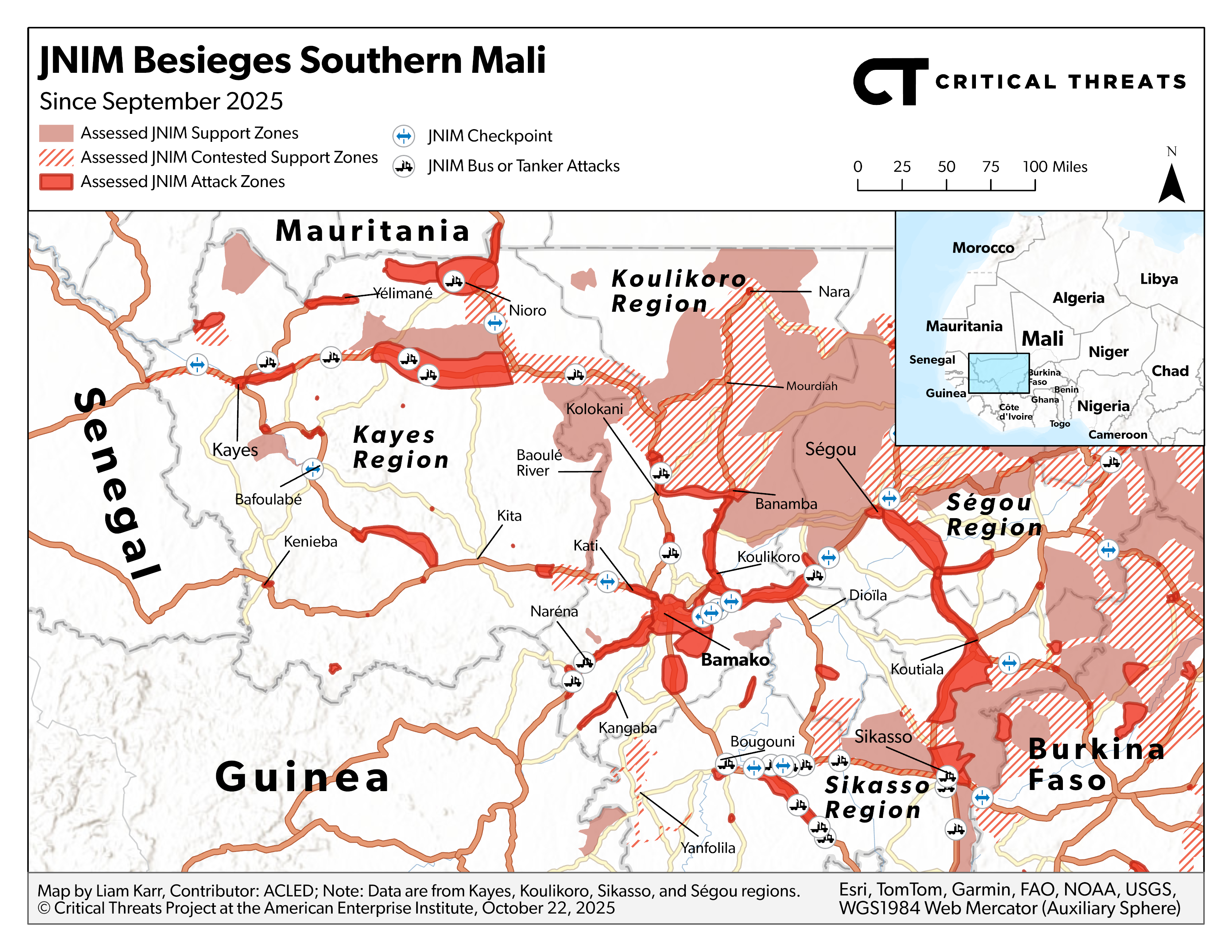 The junta has adapted its convoy protection protocols and fuel procurement strategies to alleviate pressure on Bamako. The junta has successfully transported at least 900 tankers to the capital via the Ivorian trade corridor and reshuffled the Malian military command all in the past week.[98] Local media also reported on October 24 that Russia agreed to deliver up to 200,000 tons of petroleum and agricultural products to Bamako.[99]