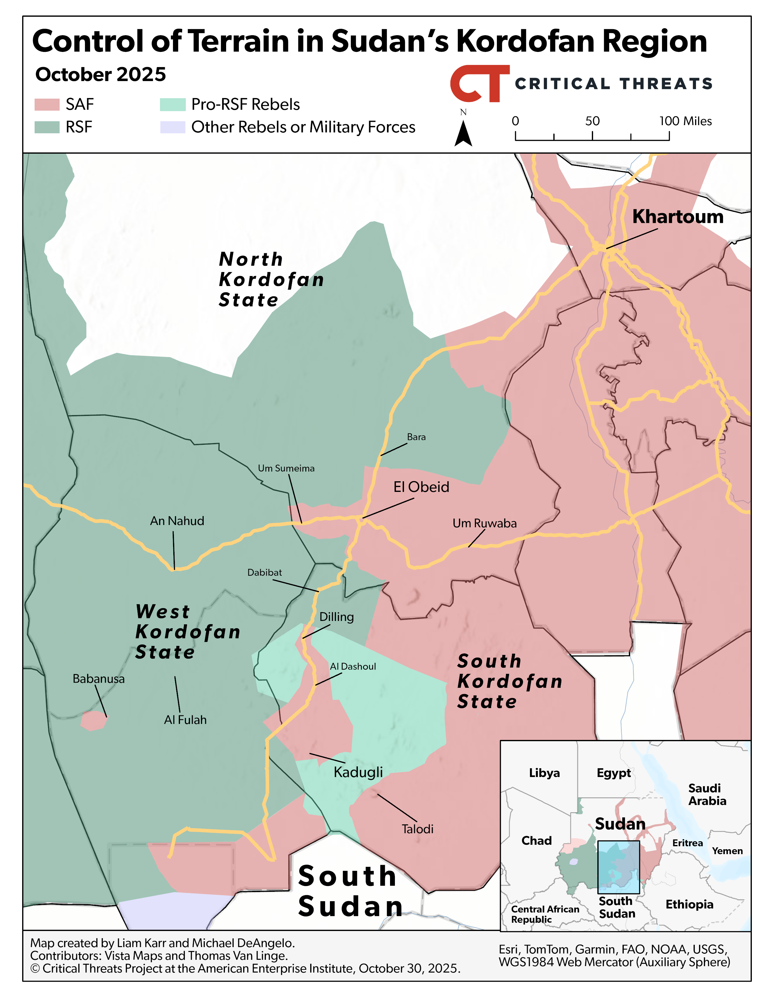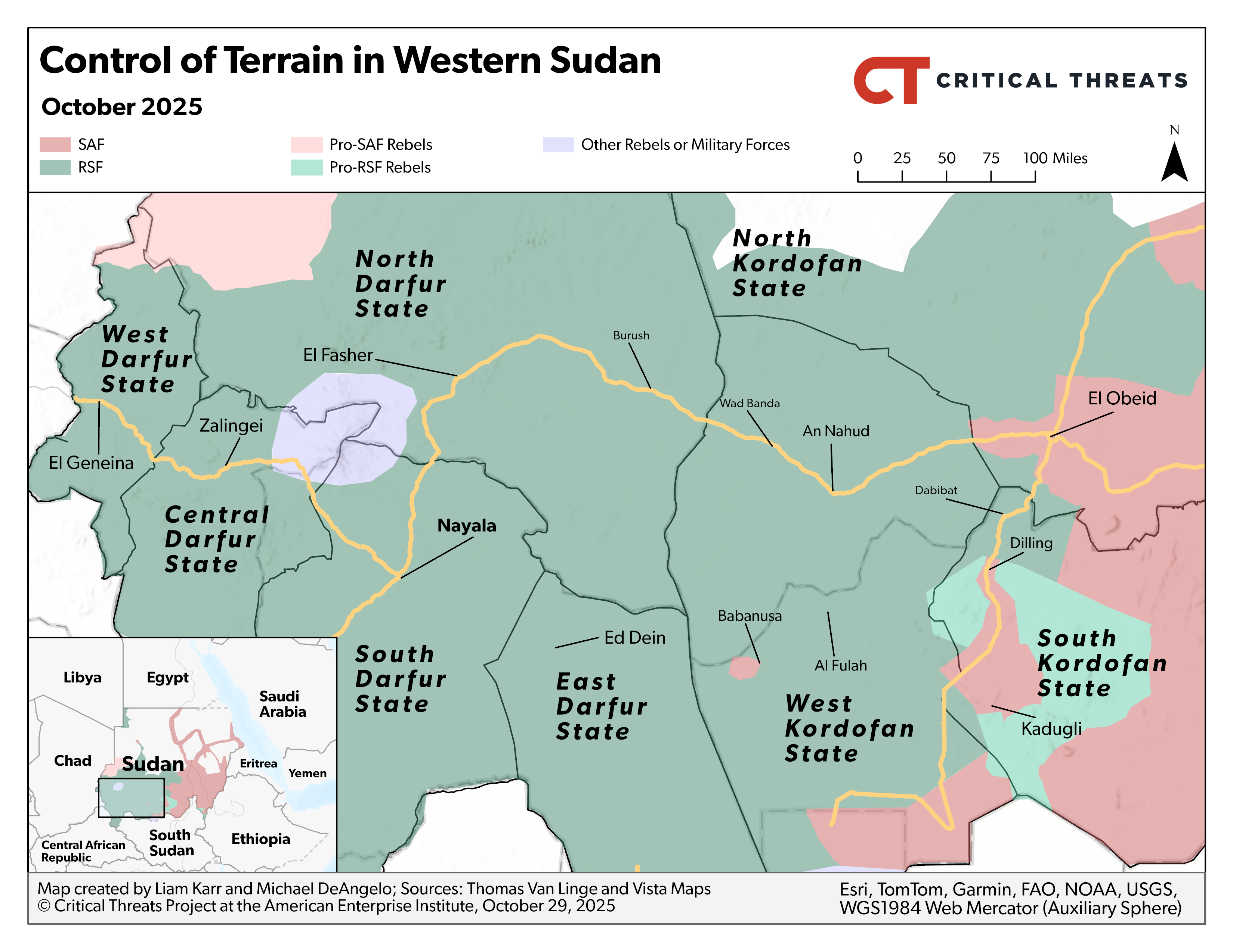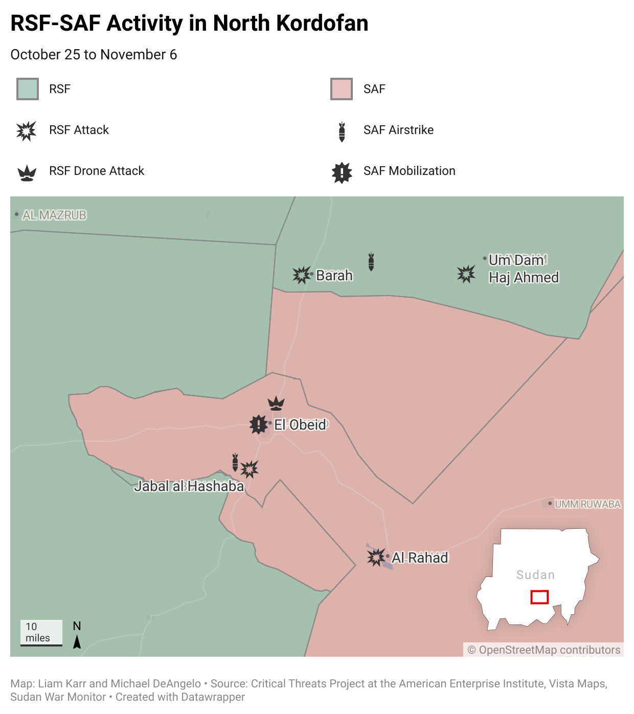 The SAF may be preparing to launch a new westward offensive from el Obeid. The SAF has responded to recent developments by announcing a general mobilization in eastern Sudan, with a local source stating that the SAF is sending senior commanders and troop reinforcements to el Obeid.[12] The SAF has reportedly secured additional military support from Egypt following the RSF’s capture of el Fasher, with Turkey also expected to supply more drones.[13] The SAF has additionally conducted airstrikes on RSF positions north, southwest, and west of el Obeid.[14] The SAF has repeatedly declared its intention to capture RSF-controlled territory in western Sudan.[15]