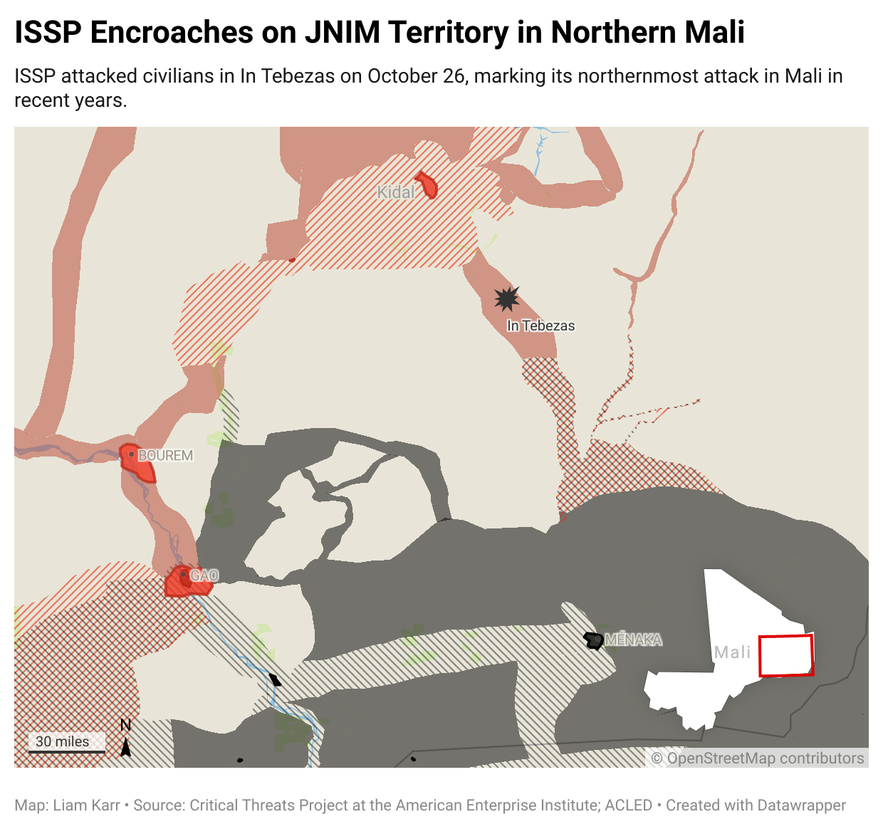 ISSP may be exploiting the vacuum to begin contesting JNIM controlled territory around Kidal. ISSP killed six civilians and kidnapped seventeen others near the Kidal-Gao regional border on October 26.[109] The attack marks ISSP’s first recorded attack in the Kidal region, nearly hundreds of miles north of its main area of operations along the Mali-Niger border.[110] JNIM and Tuareg separatists, with long-standing ties to JNIM, have dominated Kidal and its surrounding area since their emergence in 2012.
