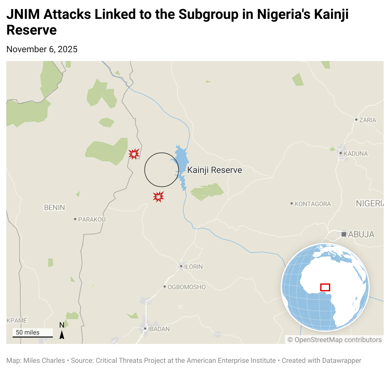 JNIM militants based in the Kainji reserve likely carried out the attack. JNIM-linked militants began settling in the Kainji reserve in early 2021, when locals reported that Francophone militants crossed into the reserve from Benin.[113] The Dutch research institute Clingendael reported in June 2024 that militants in the Kainji area had contributed to an increase in bandit-related incidents along the Benin-Nigeria border, which CTP assessed suggested links to JNIM.[114] CTP assessed in June 2025 that JNIM’s presence in the Kainji Reserve posed an attack risk for Nigeria, especially given the likely fluid relationship among JNIM-linked militants and other more Nigerian-focused groups in the Kainji area.[115]