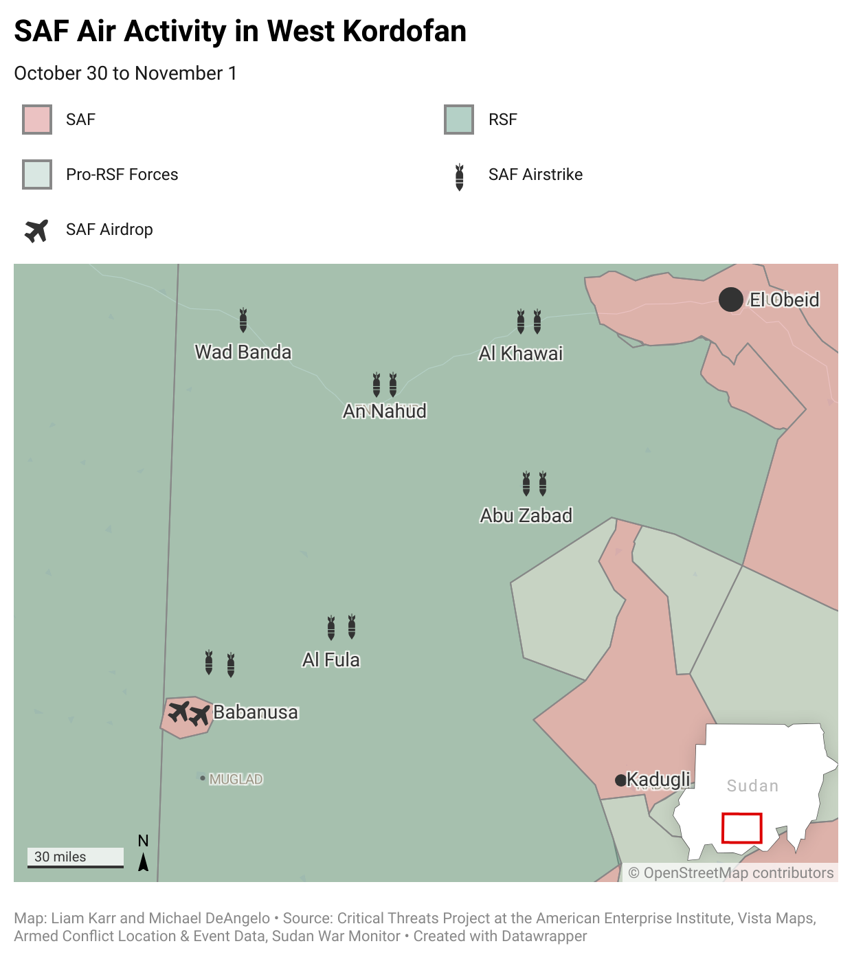 [14] https://www.darfur24 dot com/en/2025/11/03/army-airlifts-supplies-to-besieged-forces-in-babanusa-as-rsf-masses-nearby/; https://sudanwarmonitor.com/p/027; https://x.com/EastKordofan/status/1983228554994233603; https://www.aa dot com.tr/en/africa/sudanese-army-intensifies-airstrikes-on-paramilitary-rsf-positions-in-darfur-north-kordofan/3736749