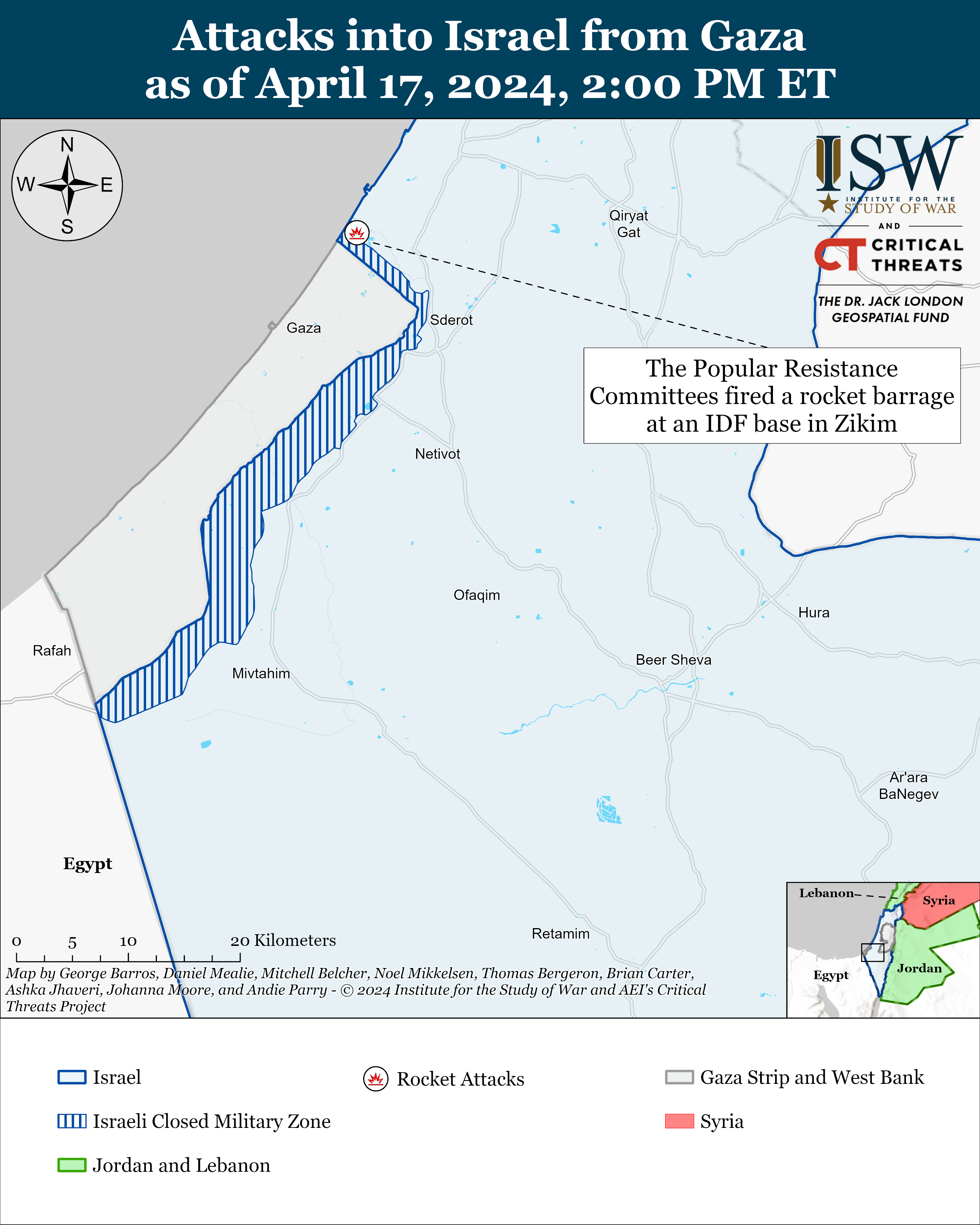 Palestinian fighters fired a single rocket barrage from the Gaza Strip into southern Israel on April 17.[xvii] The Popular Resistance Committees, which is a Palestinian militia aligned with Hamas in the war, targeted an IDF base in Zikim.