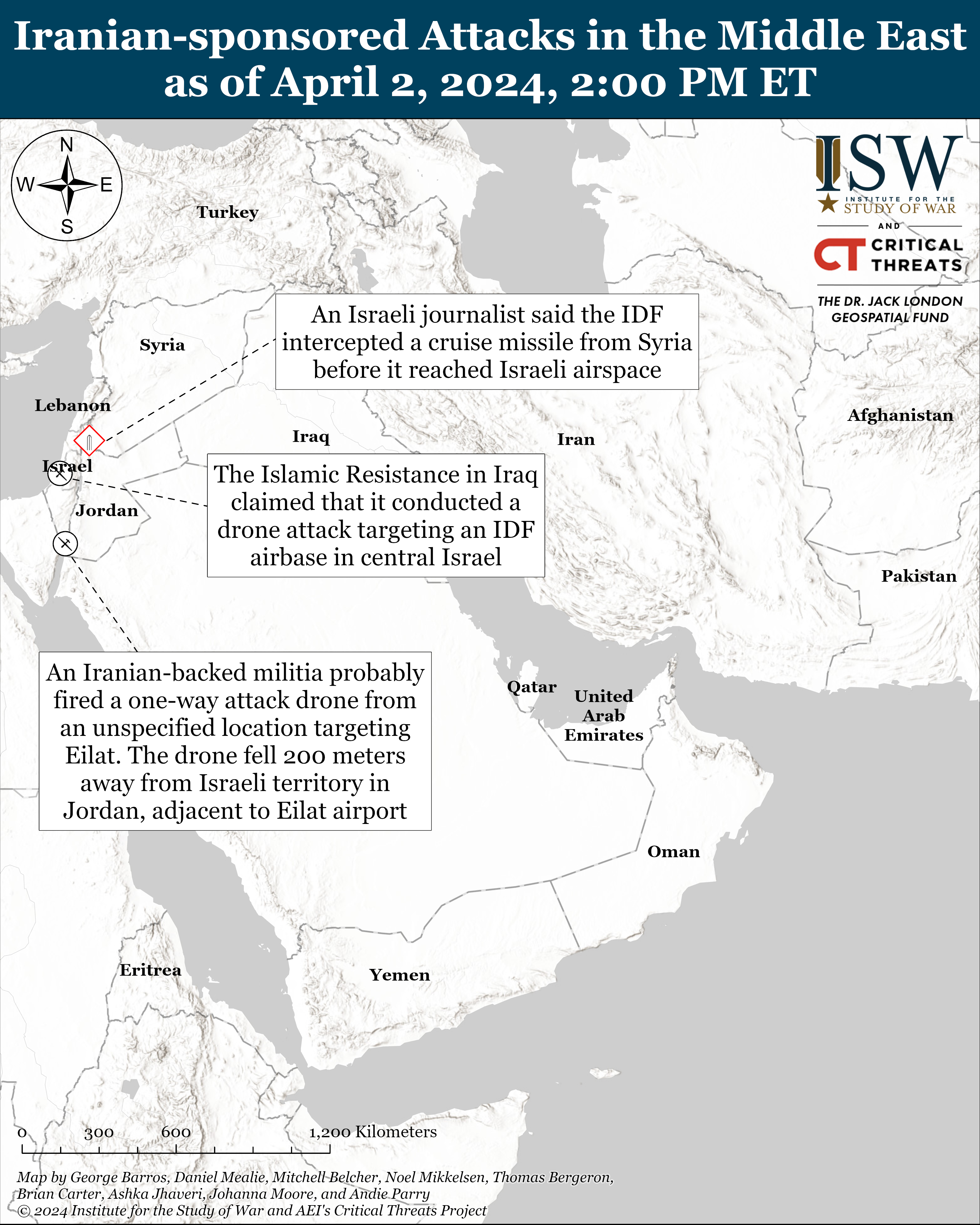 An unspecified Iranian-backed militia conducted a drone attack targeting US forces stationed at al Tanf Garrison in Homs Province, Syria, on April 1.[lxxii] Unspecified US Defense Department officials confirmed that US forces shot down a one-way attack drone targeting al Tanf.[lxxiii] US defense officials did not provide the time of the attack, nor did they confirm whether the attack occurred before or after the Israeli airstrike that killed Zahedi. The Islamic Resistance in Iraq, a coalition of Iranian-backed militias that has claimed over 190 attacks targeting US forces in Iraq and Syria since the Israel-Hamas war began, has not claimed responsibility for the attack at the time of this writing. This attack marks the first Iranian-backed militia attack targeting US forces in the Middle East since February 4.