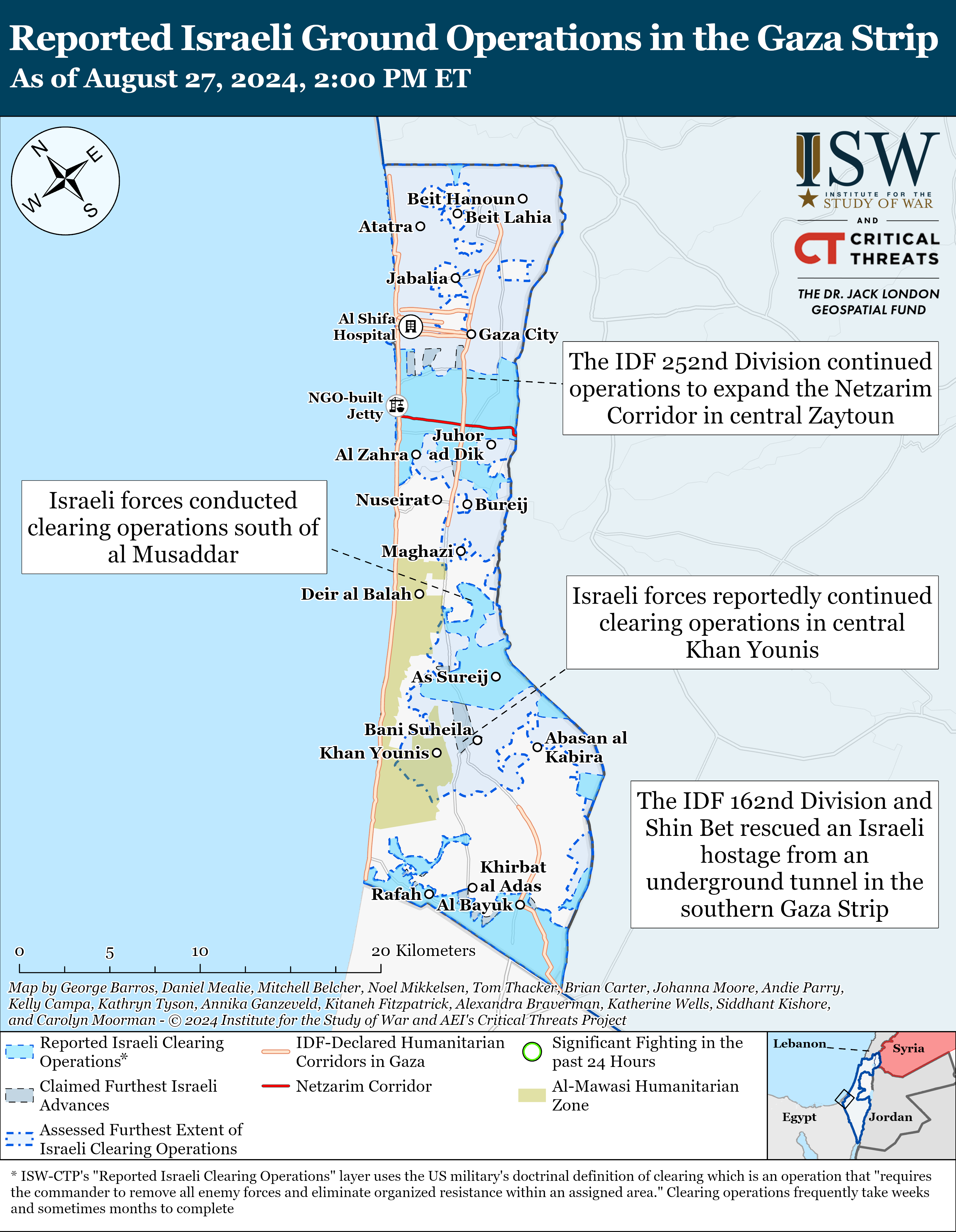 The IDF 252nd Division has likely continued clearing operations to expand the Netzarim Corridor in Zaytoun, southern Gaza City, since August 25. Commercially available satellite imagery captured on August 26 shows flattened terrain and tire tracks northwest of Salah ad Din Road in central Zaytoun, indicating that Israeli tanks or bulldozers operated in central Zaytoun. A Palestinian journalist reported that Israeli forces killed three Palestinians with small arms fire near al Imam al Shafi Mosque on August 26, suggesting that Israeli forces continued to operate in the area even though the IDF did not confirm that it did.[38] The IDF 252nd Division has been operating in Zaytoun since at least August 23 to expand IDF control over territory near the Netzarim Corridor, which divides the northern Gaza Strip from the south.[39] Hamas and other Palestinian militia have targeted Israeli forces with pre-planted improvised explosive devices (IED), mortars, and rocket-propelled grenades (RPG) since the 252nd Division began operations in Zaytoun.[40] Five IDF reservists from the IDF 16th Brigade were killed in combat in Zaytoun on August 24 and25.[41]