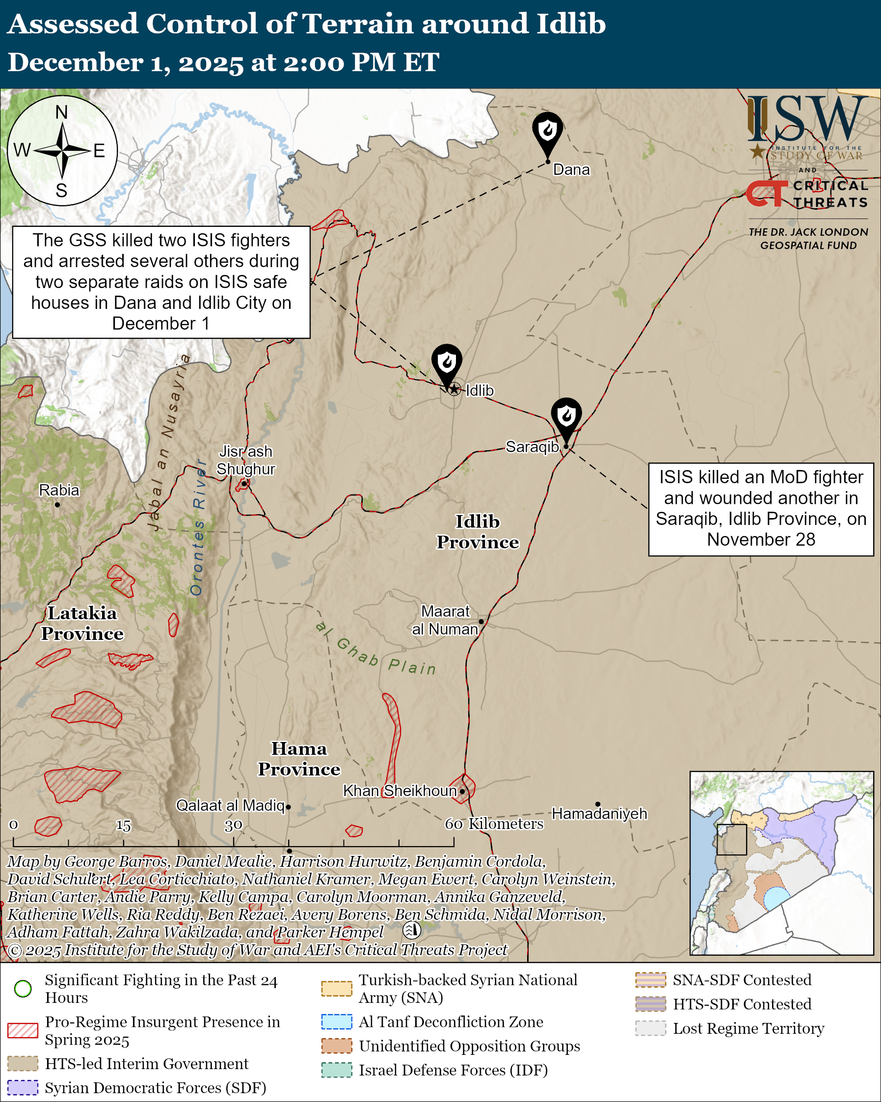 The Global Coalition Against ISIS and the Syrian GSS have conducted multiple counter-ISIS operations across Syrian government territory amid renewed ISIS activity. US Central Command (CENTCOM) announced on November 30 that its forces destroyed over 15 ISIS weapon caches in Rif Dimashq Province from November 24 to November 27 in collaboration with the Syrian MoI.[lxxviii] CENTCOM said that US and MoI forces worked together to identify and destroy the ISIS weapon caches via multiple airstrikes and controlled ground detonations.[lxxix] The GSS also killed two ISIS fighters and arrested several others during two separate raids on ISIS safe houses in Dana, Idlib Province, and Idlib City on December 1.[lxxx] The GSS seized small arms, improvised explosive devices, and suicide vests during the raids.[lxxxi] It is unclear if the GSS conducted the two raids in Idlib in response to the ISIS attack on the MoD in Saqarib on November 28.[lxxxii]