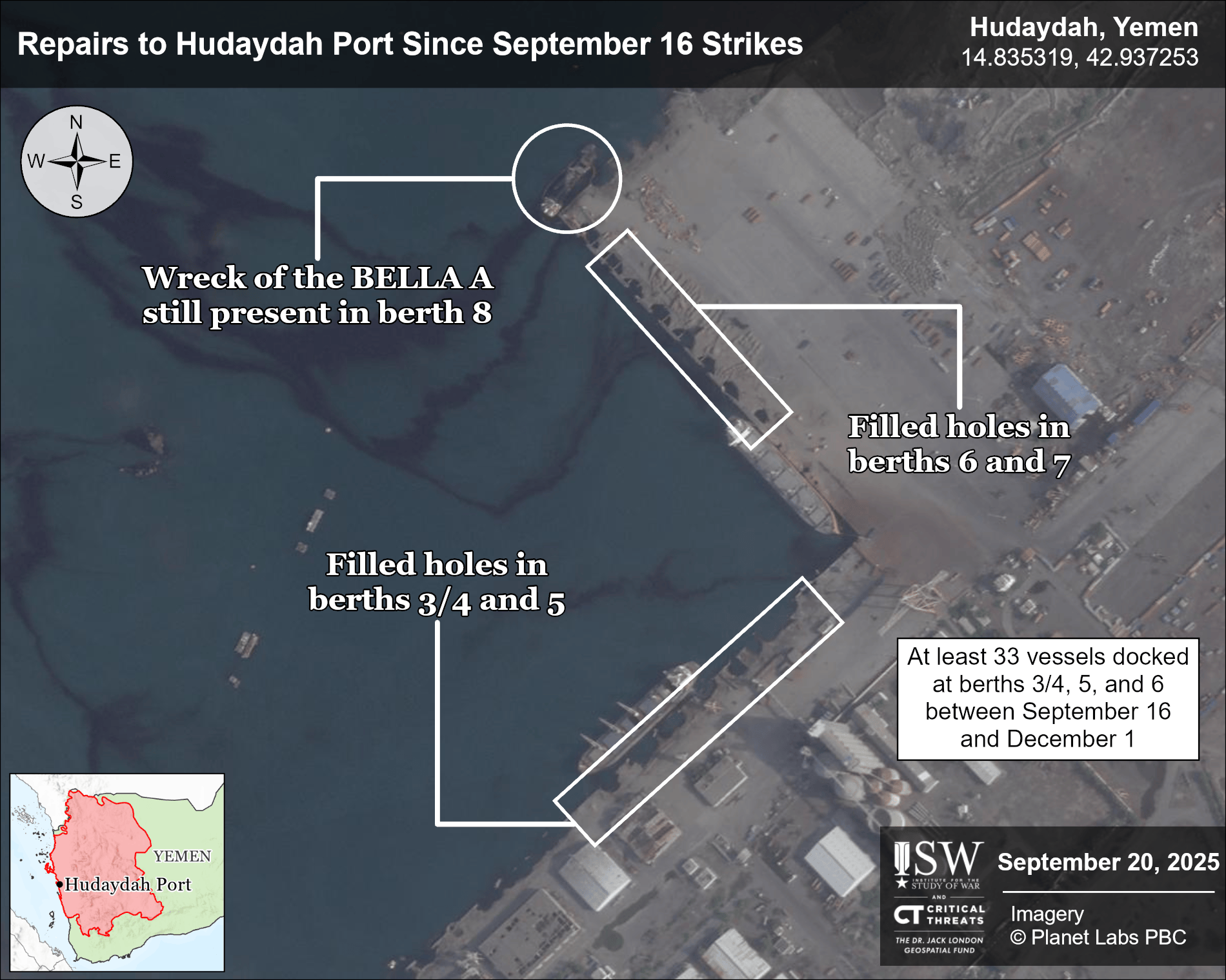 The Houthis have repaired some of the damage at Hudaydah Port from the Israeli strikes on September 16. Commercial satellite imagery from December 1 shows that the Houthis filled impact craters at berths three, four, five, six, and seven. Commercially available maritime data confirmed that only berths five, six, and a new berth formed from the remaining sections of berths three and four are operational. At least 33 vessels have docked at these berths since September 16. Israeli strikes on September 16 damaged berths four, five, six, seven, and eight, though berth six remained operational. The Houthis have only made limited repairs to berths one, two, and eight. Comoros-flagged cargo ship Bella A, which Israel likely struck on September 16, is still anchored at damaged berth eight. Satellite imagery from September 20 showed that Bella A was leaking oil or fuel into the port’s waters. Israel has repeatedly targeted the port to disrupt Houthi imports and reduce Houthi oil revenue. The Houthis have repaired each round of damage quickly since June 2025 because the port is Yemen’s largest.[lxxxiii] Iranian ships have increasingly bypassed international inspections since 2023 and offloaded uninspected cargo at Hudaydah Port, according to two UK representatives to the United Nations.[lxxxiv]
