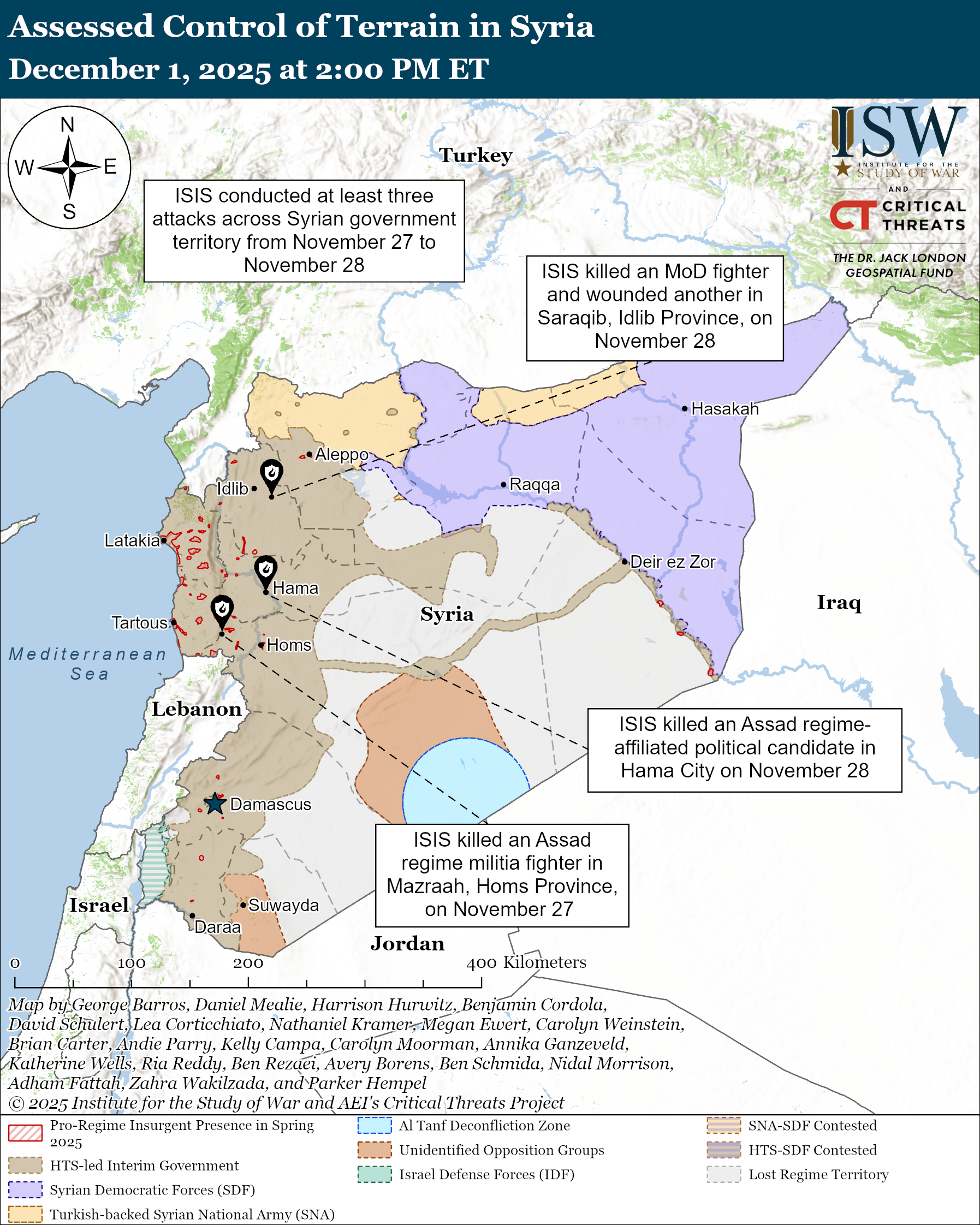 The Islamic State of Iraq and al Sham (ISIS) renewed its attacks in Syrian government territory, likely in response to Syria joining the Global Coalition Against ISIS on November 10. ISIS claimed responsibility for three attacks across Syrian government territory on November 27 and November 28, having not claimed attacks in Syrian government territory since May 2025.[lxxii] ISIS fighters killed a Shia Assad regime militia fighter in Mazraah, Homs Province, on November 27.[lxxiii] ISIS fighters then killed an Assad regime-affiliated political candidate and wounded a likely General Security Services (GSS) member in Hama City on November 28.[lxxiv] ISIS fighters separately killed one Ministry of Defense (MoD) soldier and wounded another soldier in Saraqib, Idlib Province, on November 28.[lxxv] ISIS rarely claimed attacks that its fighters likely conducted in Syrian government territory after the fall of the Assad regime in December 2024.[lxxvi] ISIS’s renewed attack claims in government territory are likely a response to the Syrian transitional government’s November 10 decision to join the Global Coalition Against ISIS. Syrian Ministry of Interior (MoI) spokesperson Noureddine al Baba warned on November 8 that the MoI expected increased ISIS activity after Syria joined the coalition, as part of an effort to boost recruitment.[lxxvii] ISIS’s decision to publicly claim these attacks, especially those that targeted former Assad regime members, is likely an attempt by ISIS to portray itself to prospective recruits as a ”true” Salafi-jihadi organization by comparing itself to the government, which most Salafi-jihadis see as heretical because the government aligned itself with the Global Coalition.