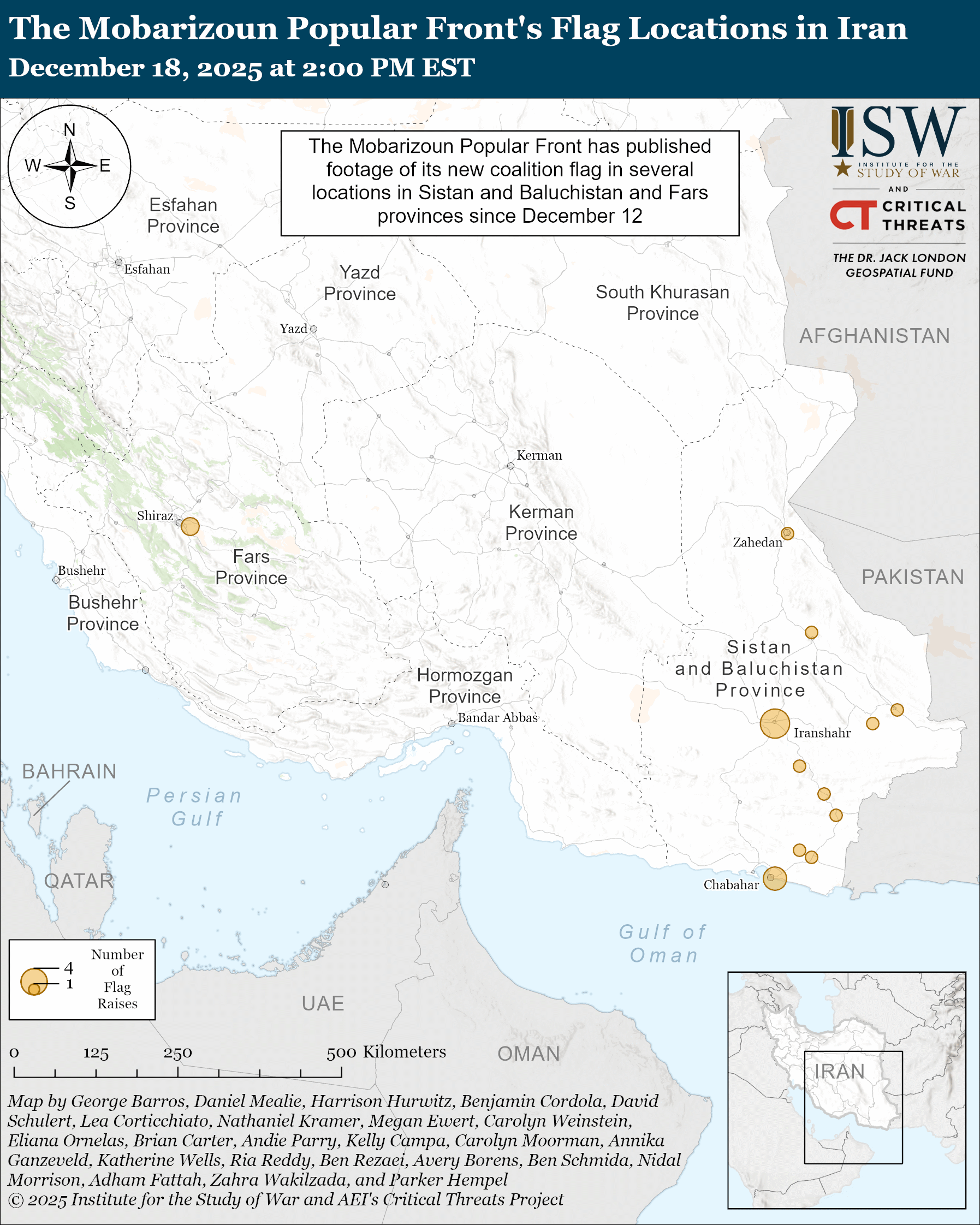 [xlvii] https://t.me/jmmfront/25 ; SITE Intelligence Group, “Recently Formed MPF Urges Balochs and Other “Freedom-Seeking” Iranians to Hold Lawful Civil Campaign Against Regime” December 16,2025, available by subscription at www.siteintelgroup.com.; https://understandingwar.org/research/middle-east/iran-update-december-16-2025/