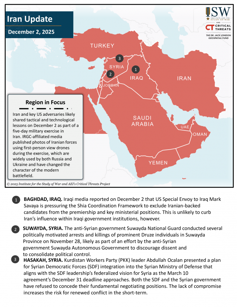Iraqi media reported on December 2 that US Special Envoy to Iraq Mark Savaya is pressuring the Shia Coordination Framework to exclude Iranian-backed candidates from the premiership and key ministerial positions.[viii] The Shia Coordination Framework is a loose coalition of Shia political parties, some of which Iran backs. Unspecified Iraqi political sources told Iraqi media on December 2 that the framework may change its government formation strategy in response to US pressure.[ix] A framework member confirmed that the framework discussed its response to Savaya on December 1.[x] The framework is reportedly trying to find a “consensus candidate” for prime minister who is acceptable to the framework and any “regional or international forces influential in Iraqi politics,” which suggests that it is trying to balance Iranian and US pressures regarding government formation.[xi] The United States has repeatedly pressured the Iraqi government to limit Iranian influence within the Iraqi government and previously expressed concern about powerful Iran-aligned parties that ran in the November 2025 parliamentary elections.[xii]