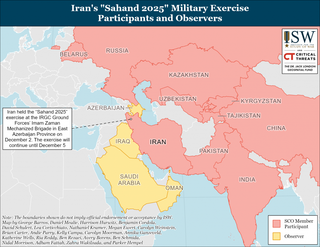 Iran and key US adversaries likely shared tactical and technological lessons on December 2 as part of a five-day military exercise in Iran. Iran is holding the “Sahand 2025” counterterrorism exercise at the Islamic Revolutionary Guards Corps (IRGC) Ground Forces’ Imam Zaman Mechanized Brigade in East Azerbaijan Province from December 1 to 5.[i] Iran faces security threats along its northwestern border near East Azerbaijan Province from Kurdish groups, including the Kurdistan Democratic Party of Iran (KDPI), Komala, the Free Life Party of Kurdistan (PJAK), and the Kurdistan Freedom Party (PAK).[ii] All ten members of the Shanghai Cooperation Organization (SCO), which includes Russia, Belarus, and China, sent military delegations to participate in the exercise.[iii] The SCO has historically emphasized counterterrorism as a key goal of the institution.[iv] Saudi Arabia, Azerbaijan, Oman, and Iraq also attended as observers.[v] IRGC-affiliated media published photos of Iranian forces using first-person view (FPV) drones during the exercise, which are widely used by both Russia and Ukraine and have changed the character of the modern battlefield.[vi] These drones, when employed at scale, can ”perform a wide array of functions but have been particularly transformative in creating a nearly-transparent battlefield.”[vii] This transparency has applications outside of conventional warfare, as seen in Ukraine. Drones could be employed in Iran to assist counter-insurgency operations in border regions or to help suppress protests, for example.