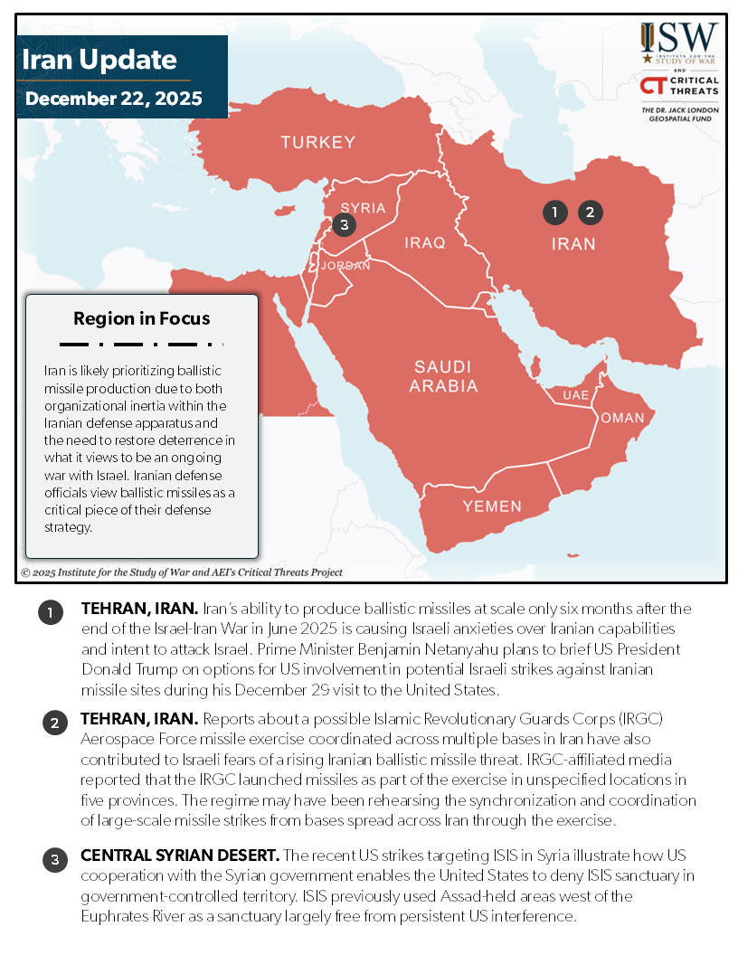 - Israeli Threat Perceptions: Iran’s ability to produce ballistic missiles at scale only six months after the end of the Israel-Iran War in June 2025 is causing Israeli anxieties over Iranian capabilities and intent to attack Israel. Prime Minister Benjamin Netanyahu plans to brief US President Donald Trump on options for US involvement in potential Israeli strikes against Iranian missile sites during his December 29 visit to the United States. Israeli intelligence agencies do not believe Iran’s current missile production pace requires urgent military action within the next few months, but warn it could become a more urgent issue later in 2026.