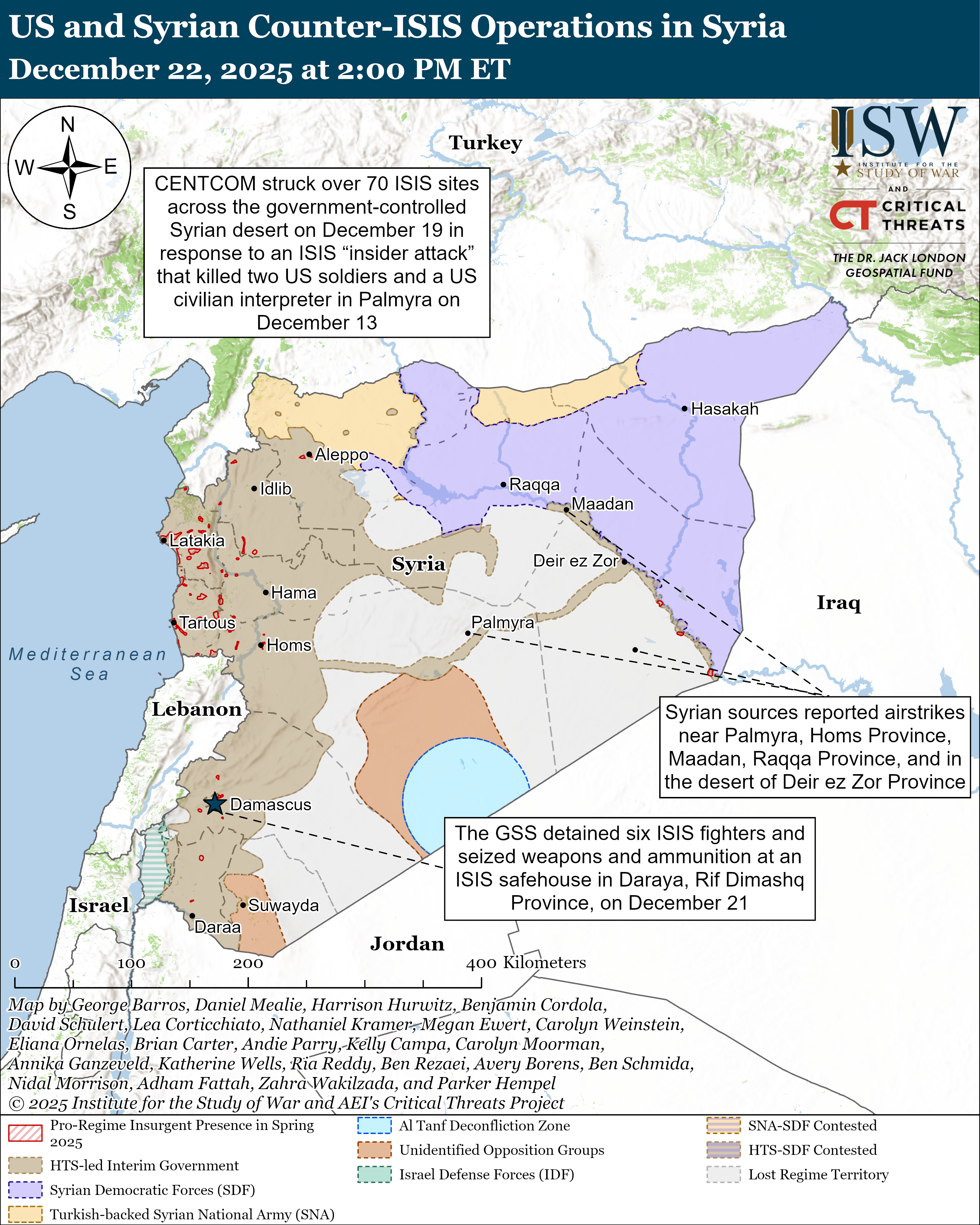 ISIS previously used central Syria as an area to reconstitute itself, free from US interference. The Assad regime, which previously controlled central Syria, conducted ineffective counter-ISIS operations that failed to disrupt ISIS reconstitution. US forces were unable to enter Assad-held areas, given the hostility between Assad and the United States. The fall of Assad, combined with US cooperation with the Syrian government, has now enabled the United States to conduct strikes and other operations to disrupt ISIS reconstitution. A US official told NBC News on December 19 that the operation intended to strike areas where ISIS is attempting to reorganize to destroy their positions and forces on a large scale.[l] Two unspecified US sources told Western media that US retaliatory strikes may continue for several weeks or even a month.[li]