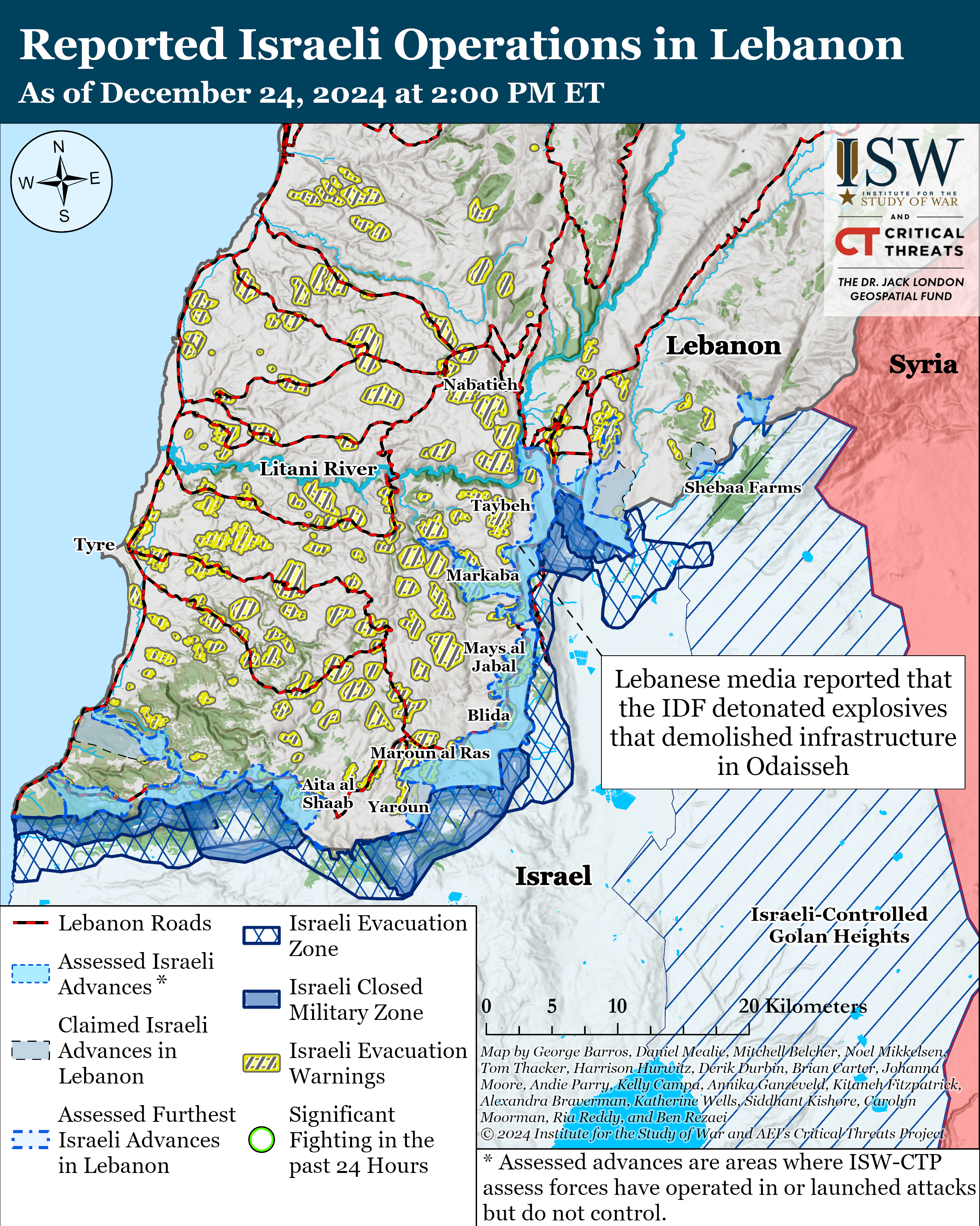 Lebanese media reported that the IDF detonated explosives that demolished buildings in Odaisseh, southeastern Lebanon, on December 24.[xlviii] The IDF is permitted to operate in southern Lebanon until the end of January 2025 according to the Israel-Lebanon ceasefire.[xlix]