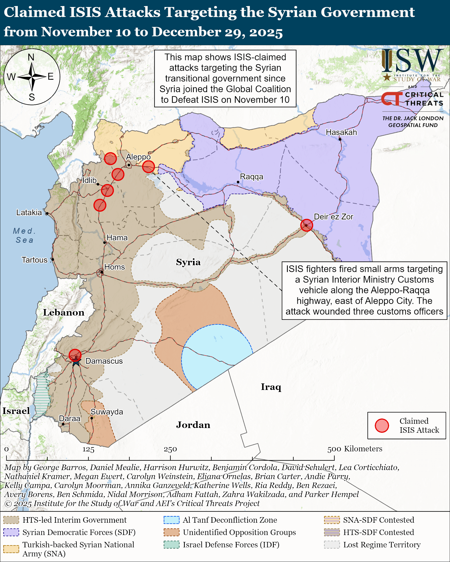 Islamic State in Iraq and al Sham (ISIS) fighters are continuing to attack Syrian transitional government personnel in northern Syria after Syria joined the Global Coalition to Defeat ISIS in November 2025. ISIS fighters fired small arms targeting a Syrian Interior Ministry Customs vehicle along the Aleppo-Raqqa highway near Kuweires, east of Aleppo City, on December 26.[xcvii] The attack wounded three customs officers.[xcviii] ISIS has increased the rate and geographic range of its attacks in government-controlled territory since Syria joined the Global Coalition to Defeat ISIS on November 10.[xcix] ISIS has claimed at least eight attacks since November 10 in which ISIS fighters have targeted Syrian army soldiers, Interior Ministry officers, and one judicial official.[c] A BBC Salafi-jihadi expert noted on December 13 that high-profile Islamic State (IS) supporters have encouraged ISIS sympathizers to conduct attacks against the Syrian transitional government “whenever and wherever possible” in the weeks since Syria joined the Global Coalition, which may be motivating some of these attacks.[ci]