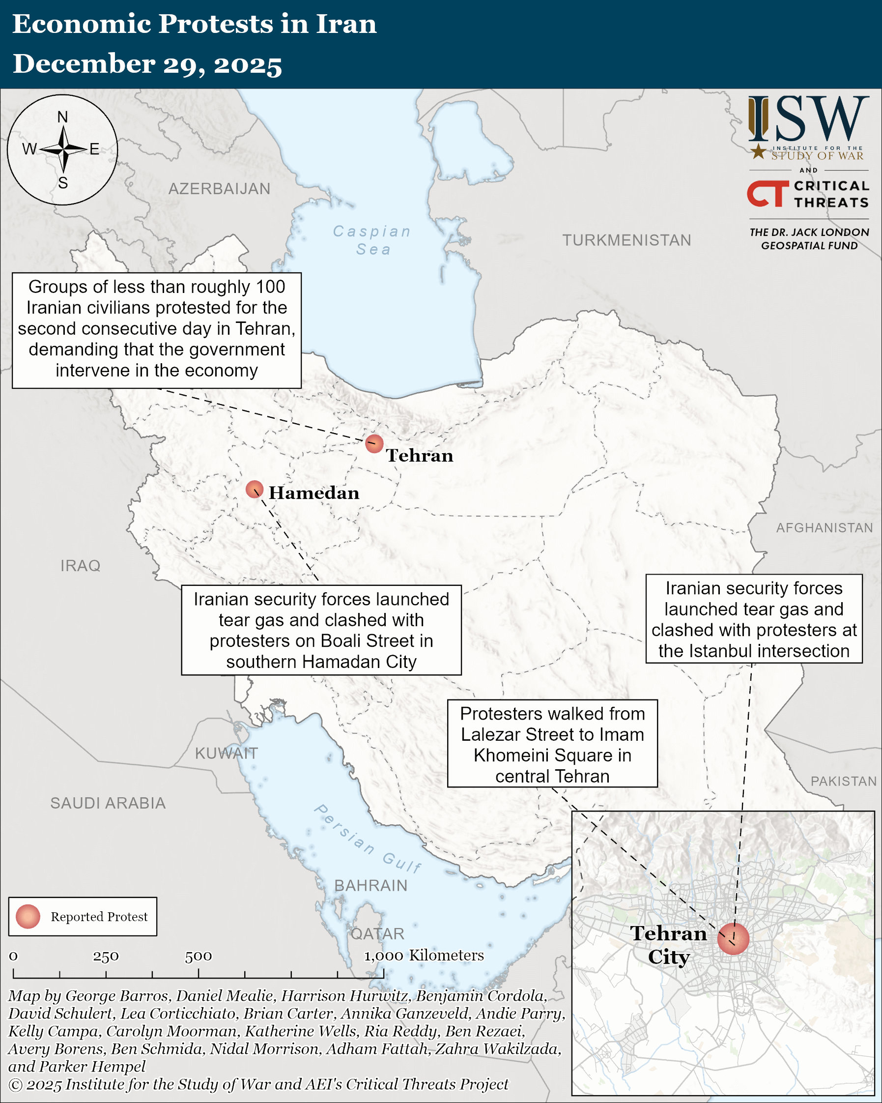 Small-scale protests demanding that the Iranian government address the devaluation of the Iranian rial and high inflation rates have continued for the second consecutive day in Tehran and Hamadan City, western Iran, on December 29, amid a rapid collapse of the Iranian currency since November 2025.[i] The value of the Iranian rial has deteriorated rapidly after November 2025, though its value has fallen for years due to sanctions and Iran’s general international isolation. Protests initially began in Tehran on December 28.[ii] Groups of less than roughly 100 civilians, who were reportedly Iranian ”businessmen,” marched from Lalezar Street toward the Imam Khomeini Square on December 29, demanding that the Iranian government intervene in the economy and address the high inflation rate and devaluation of the currency. Iranian security forces halted and clashed with the protesters at the Istanbul intersection on December 29, according to Islamic Revolutionary Guards Corps (IRGC)-affiliated media and geolocated footage.[iii] Iranian security forces also launched tear gas and clashed with protesters on Boali Street in southern Hamedan City on December 29.[iv] A BBC Persian journalist reported that economic protests also occurred in Malard City, Tehran Province, and on Gheshm Island in the Persian Gulf, but did not provide footage of the protests at the time of this writing.[v] Tehran merchants announced that they will continue to protest on December 30.[vi] The protests come amid a drop in the value of the Iranian rial. The value of the Iranian rial reached 1,445,000 rials per one US dollar as of December 28, which marks its lowest value in 2025.[vii] The rial appreciated slightly to 1,371,000 rials to one US dollar on December 29, however.[viii]