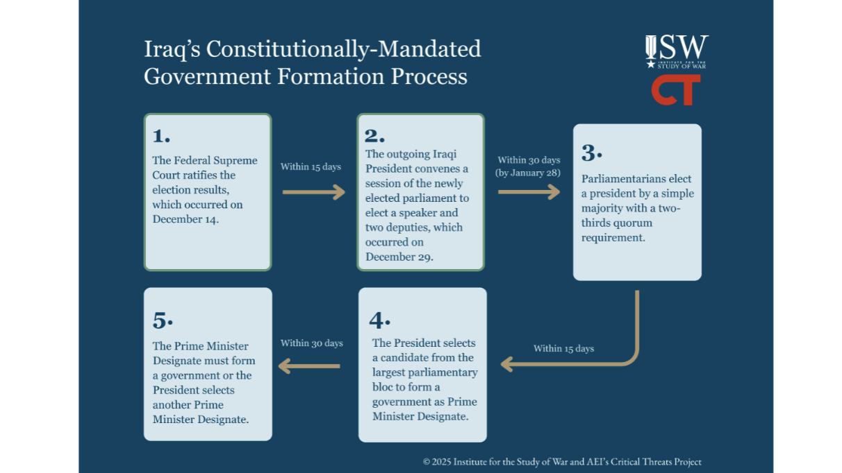 The new Iraqi Parliament elected Progress Party parliamentarian Haibat al Halbousi as parliament speaker on December 29.[li] Haibat al Halbousi is the cousin of former Parliament Speaker and Progress Party head Mohammad al Halbousi, which indicates that Mohammad al Halbousi likely negotiated a deal with Iranian-backed Iraqi actors to support Haibat’s election. Iraq’s Federal Supreme Court, which is aligned with the Iranian-backed Badr Organization and former Prime Minister and State of Law Coalition head Nouri al Maliki, removed Mohammad al Halbousi from his position as parliament speaker in 2023, ostensibly for “forgery.”[lii] The court removed Halbousi after he reportedly blocked a parliamentary vote that would have called for the expulsion of the US ambassador[liii]. The ruling was unconstitutional, and Halbousi said that unspecified parties sought to use the ruling to “sow divisions“ in society.[liv] Halbousi’s replacement, former First Deputy Speaker Mohsen al Mandalawi, supported the expulsion of US forces by Iranian-backed militias[lv] The militias then repeatedly blocked Halbousi’s preferred candidate from winning the speakership throughout early 2024 and escalated their efforts to expel US forces with Mandalawi’s support.[lvi] The timing of Halbousi’s removal in November 2023, combined with the militias‘ efforts to prevent the speakership from going to a Halbousi-backed candidate in the months following, strongly suggests that the militias orchestrated his removal. The assumption of the speakership by Halbousi ally indicates that Halbousi has cut a deal with the militias, though the specifics of that deal are unclear.