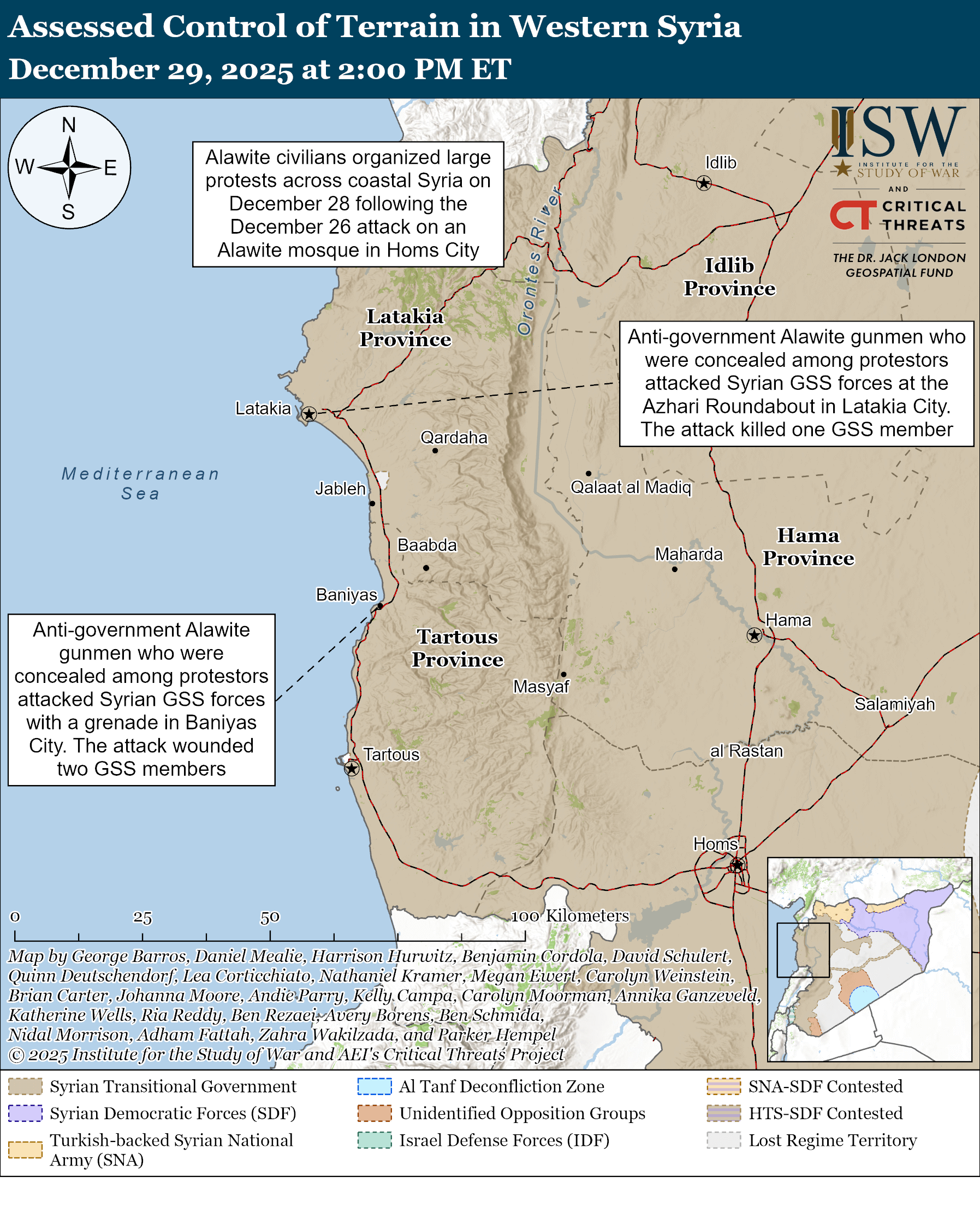 - Anti-Government Insurgents in Syria: Unspecified anti-government Alawite fighters took advantage of civilian protests over legitimate Alawite grievances to attack government security forces in coastal Syria on December 28. The unspecified attackers may have been Alawite insurgents who deliberately sought to trigger an aggressive government retaliation. Assadist-style slogans at the protests and the attacks themselves suggest nascent support for Alawite insurgent groups and fertile grounds for recruitment.