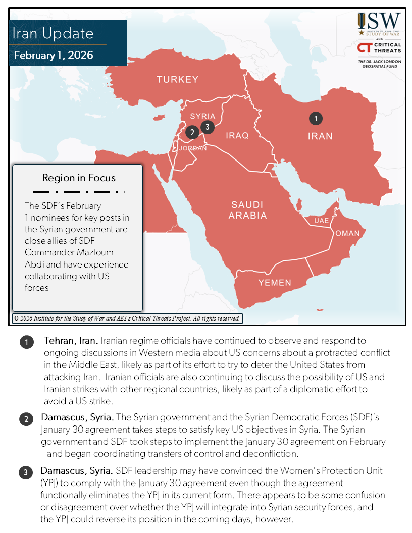 - Syrian Government-SDF Agreement: The Syrian government and the Syrian Democratic Forces (SDF)’s January 30 agreement takes steps to satisfy key US objectives in Syria. The Syrian government and SDF took steps to implement the January 30 agreement on February 1 and began coordinating transfers of control and deconfliction.