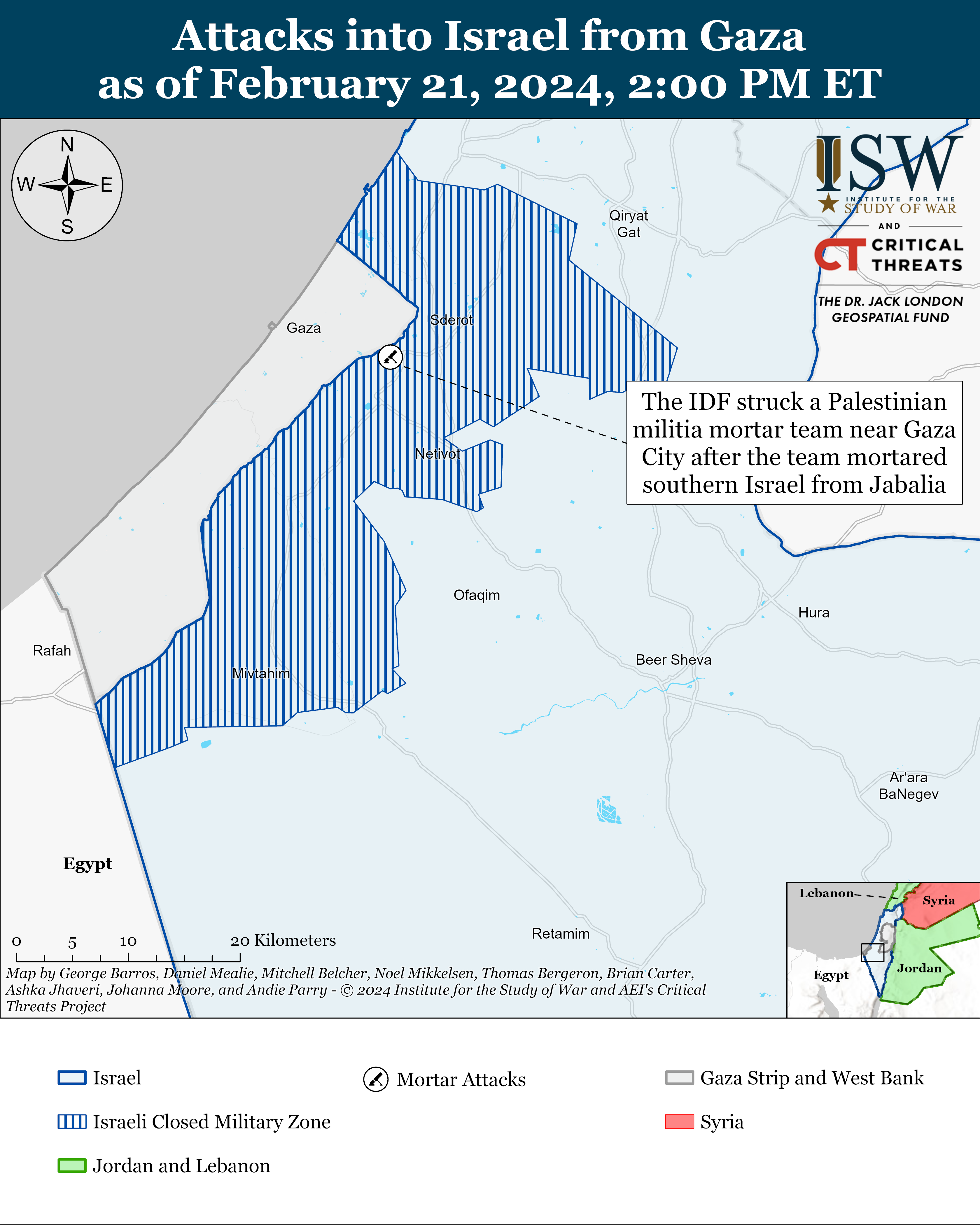 Israeli forces clashed with Palestinian fighters at least three times in the West Bank after CTP-ISW's last data cutoff on February 20.[lx] Israeli forces detained 40 wanted individuals and confiscated weapons across the West Bank on February 21.[lxi]