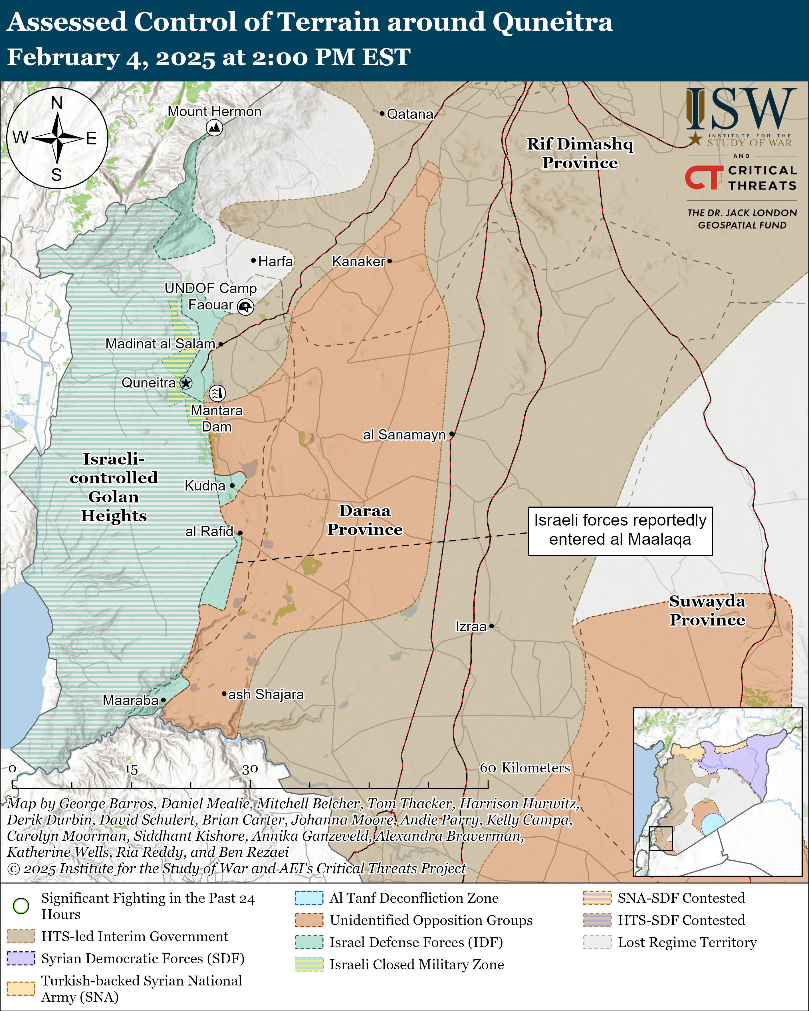 Israeli forces likely continued operations in southern Syria on February 4. Syrian media reported that a convoy of Israeli military vehicles briefly entered al Maalaqa, Quneitra Province, on February 4.[lxi] CTP-ISW cannot verify local reporting. Israeli forces remained stationed in several positions within the disengagement zone between Syria and the Israeli-controlled Golan Heights.[lxii]
