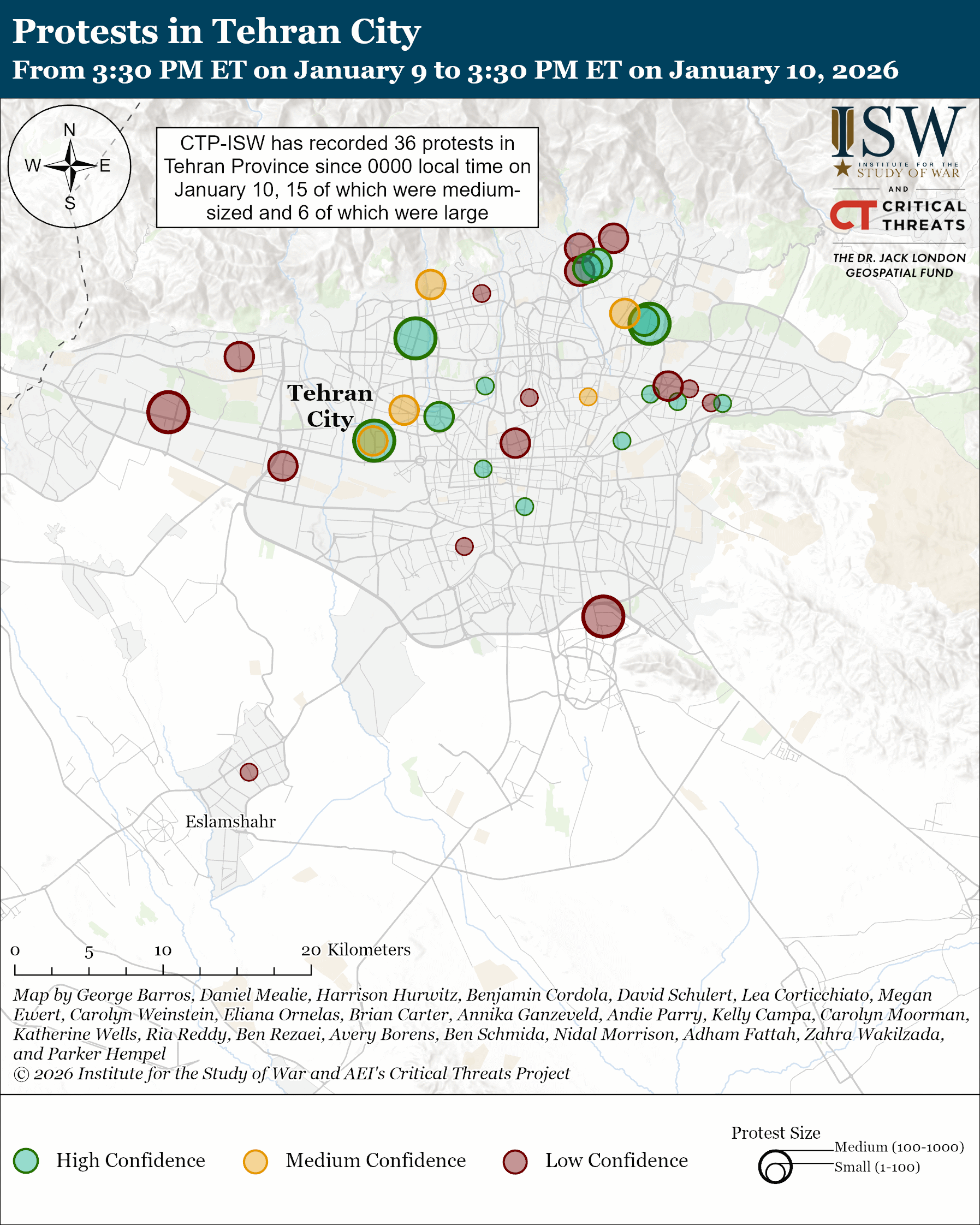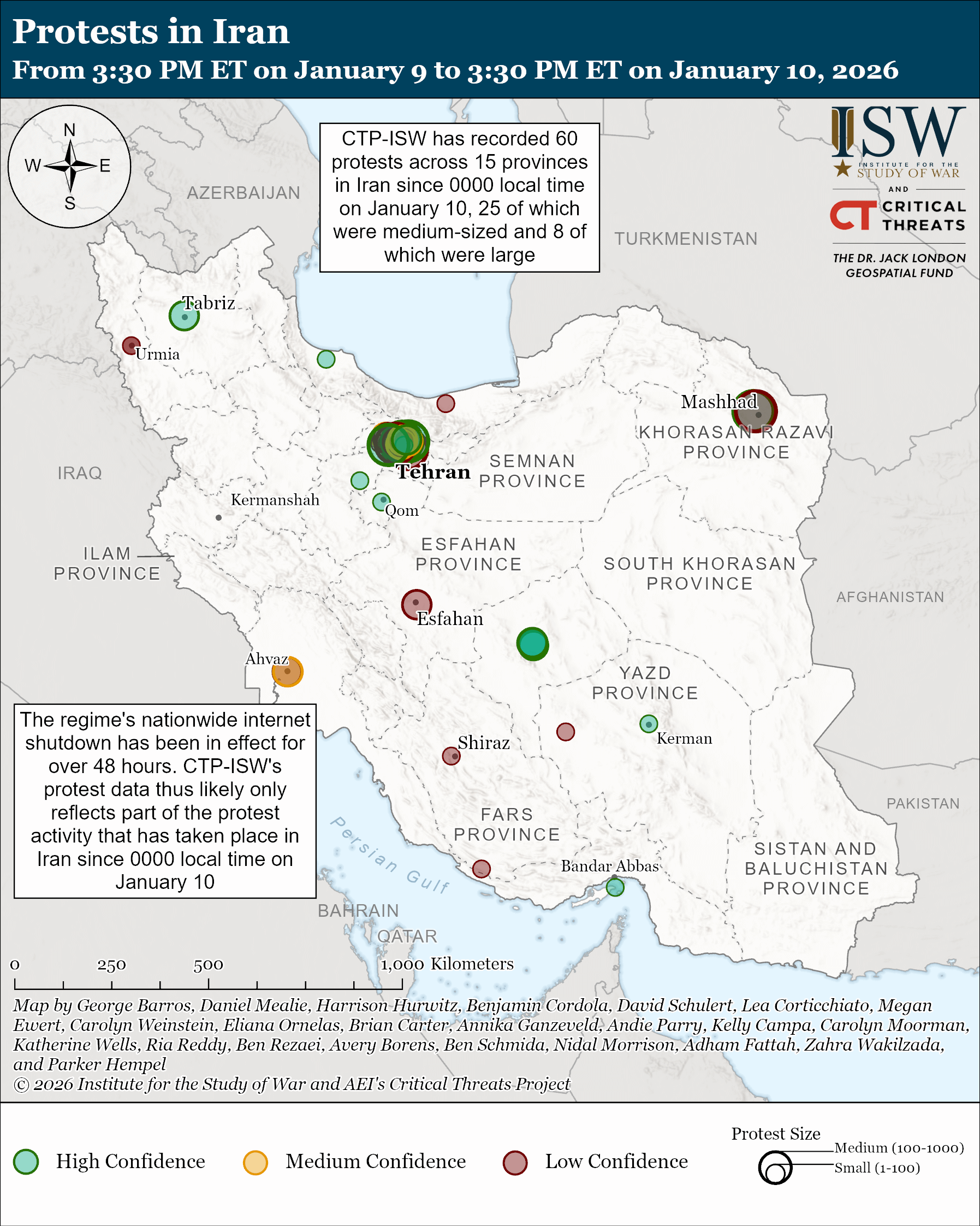 - Protests in Iran: Protest activity has continued to take place across Iran amid the Iranian regime’s continued nationwide internet shutdown. CTP-ISW has recorded 60 protests across 15 provinces since 0000 local time on January 10, 25 of which were medium-sized and eight of which were large.