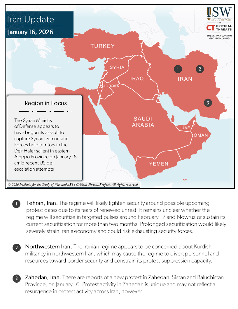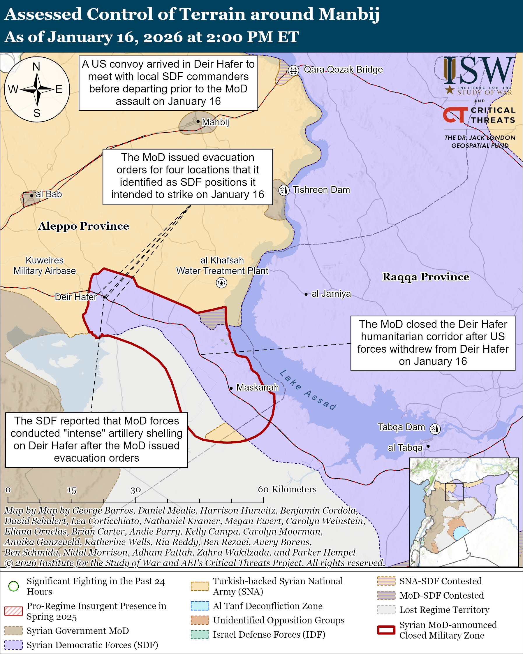 - Syrian Military Operations in Aleppo Province: The Syrian Ministry of Defense appears to have begun its assault to capture Syrian Democratic Forces (SDF)-held territory in the Deir Hafer salient in eastern Aleppo Province on January 16 amid recent US de-escalation attempts. This ground operation will likely remain limited to eastern Aleppo Province.