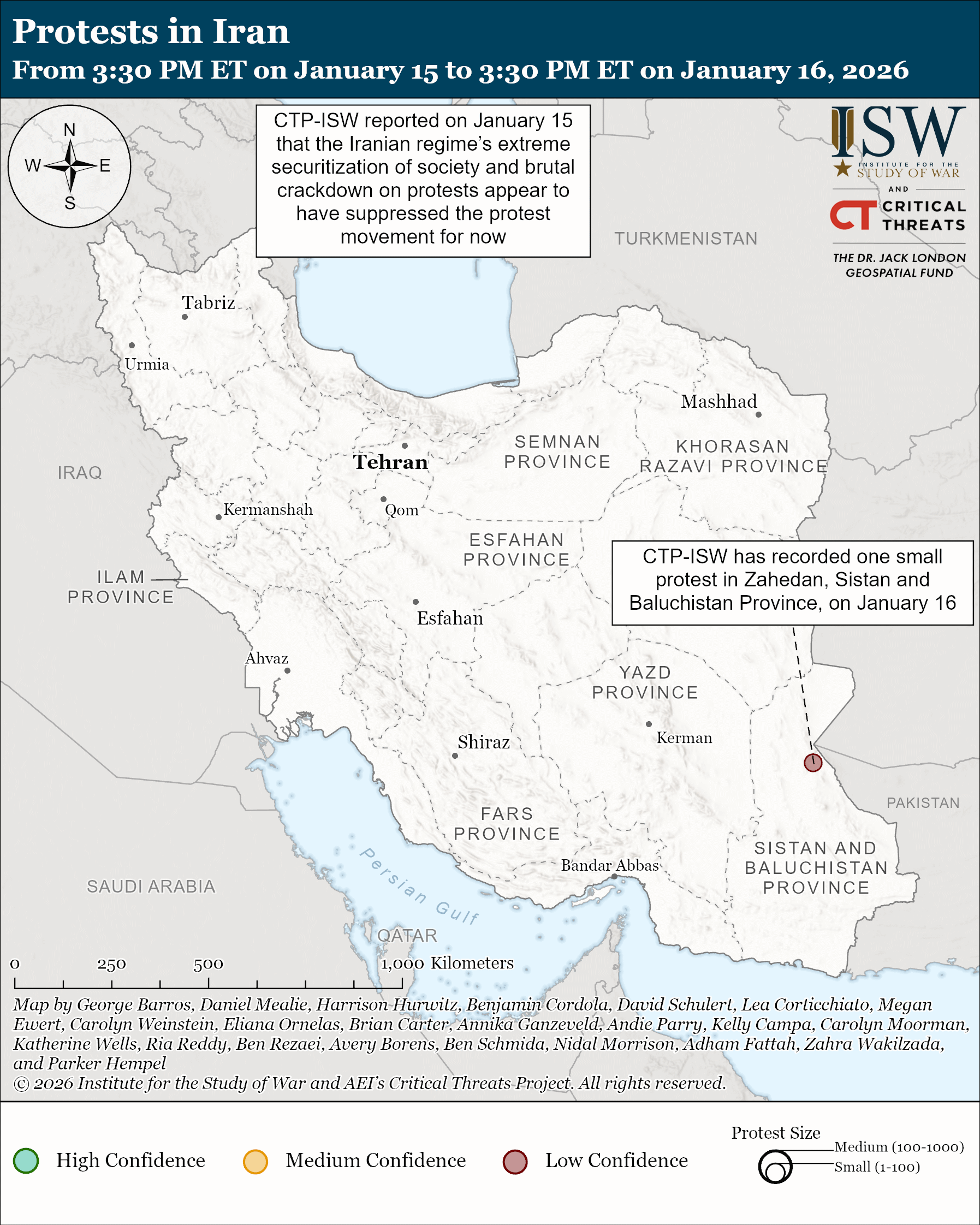 Click here to see CTP-ISW’s new interactive map showing the locations of daily protests in Iran since December 28, 2025. CTP-ISW will continue to publish daily static maps depicting the Iranian protests in forthcoming Iran Updates.