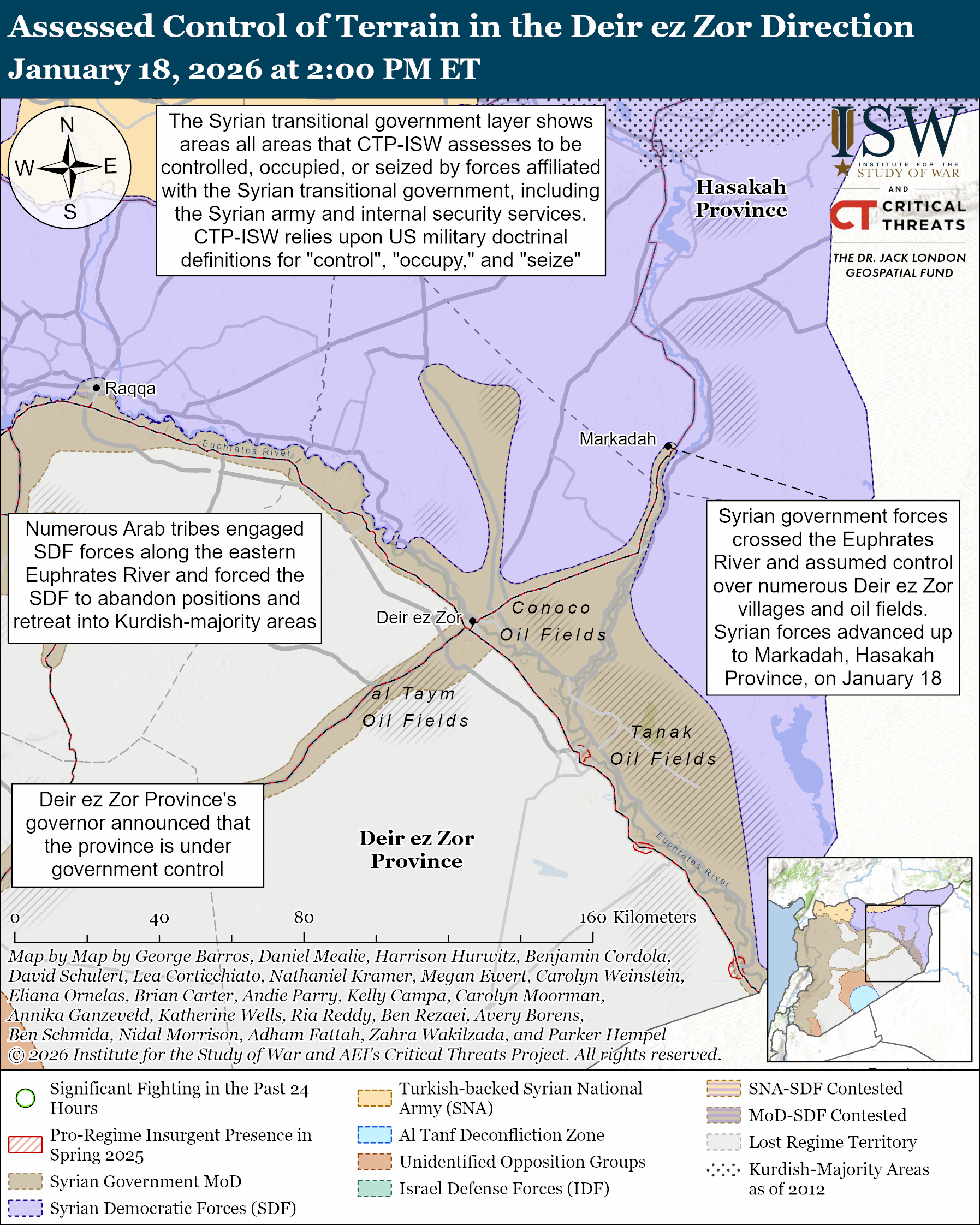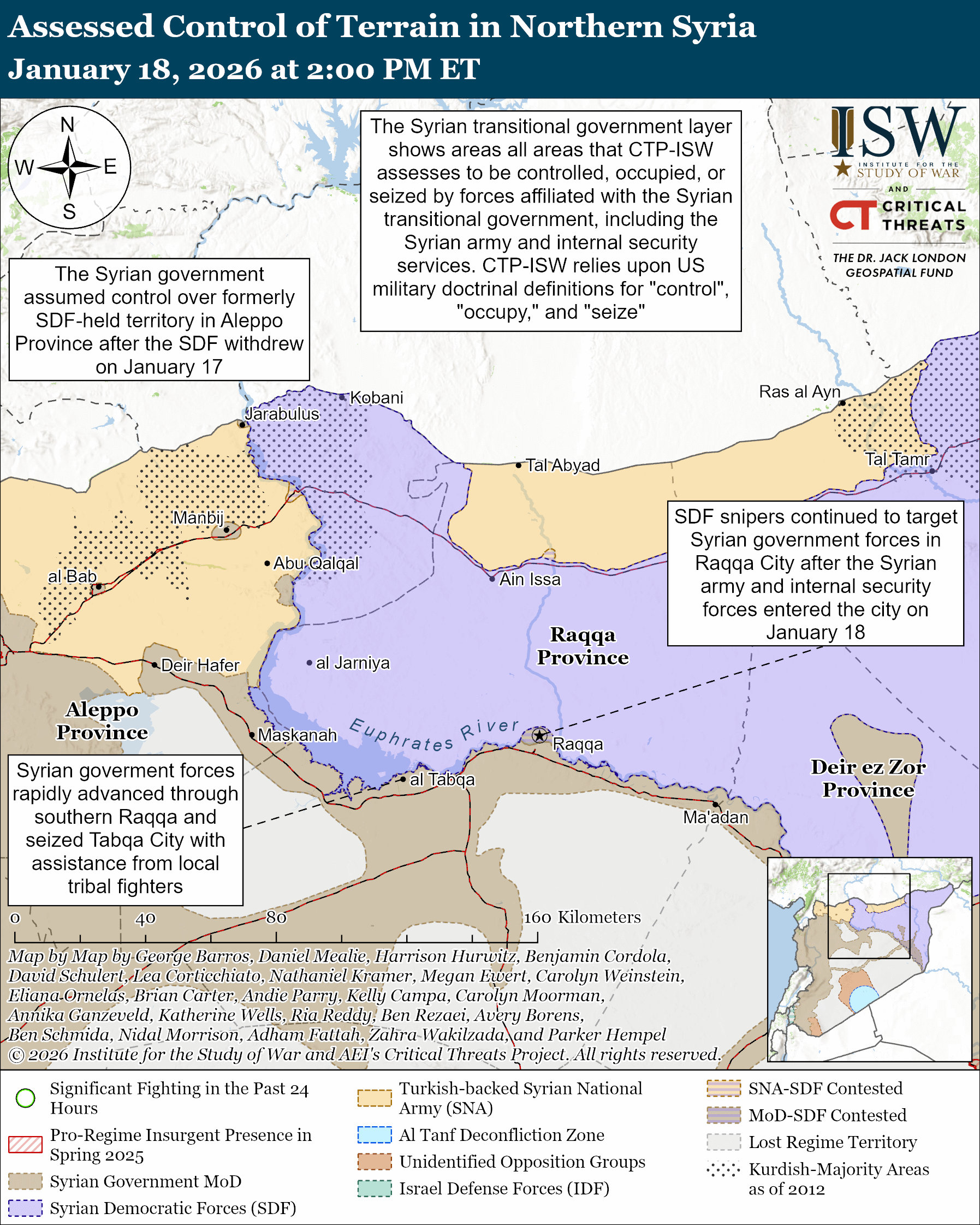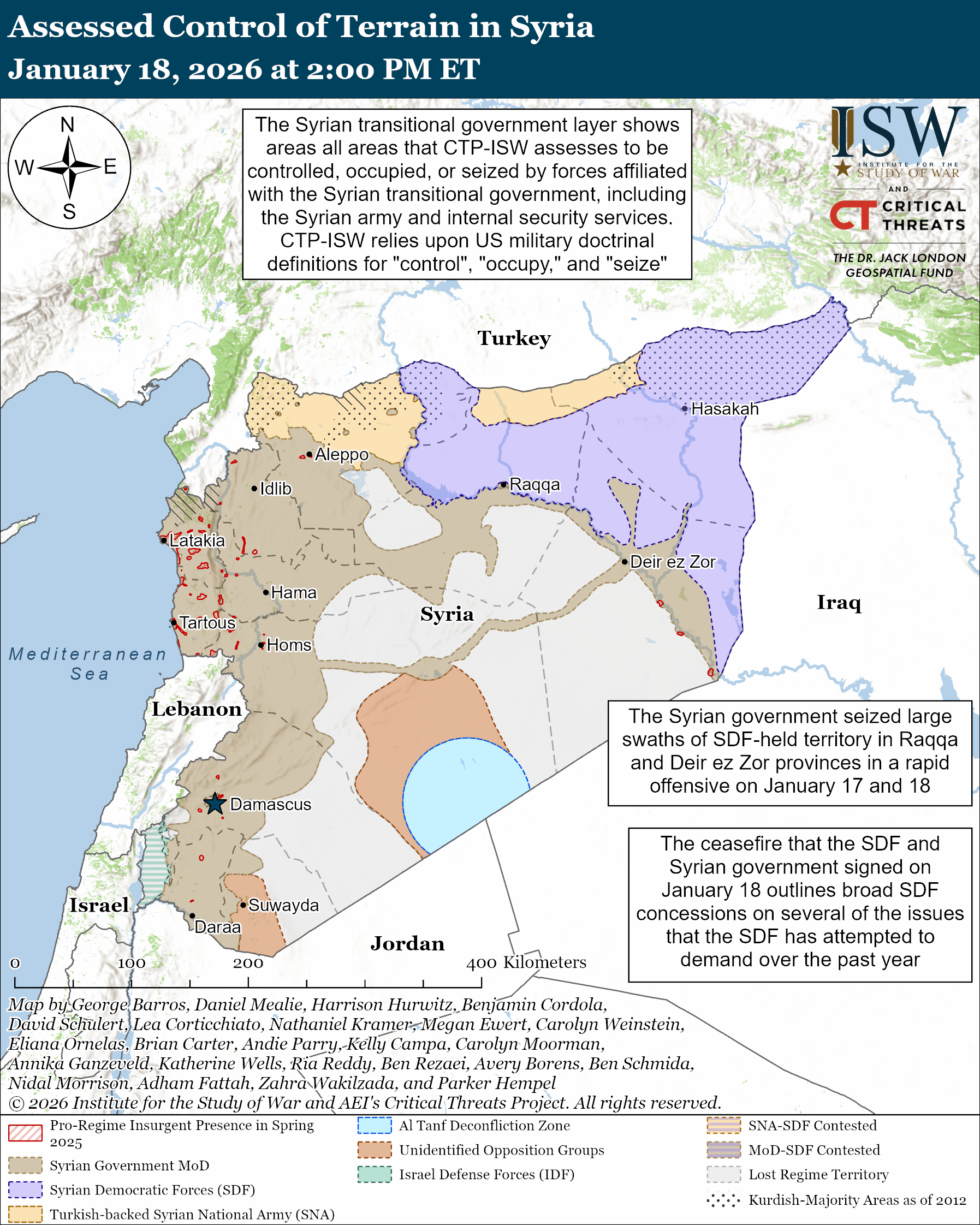 - SDF Collapse: The ceasefire that Syrian Democratic Forces (SDF) Commander Mazloum Abdi and Syrian President Ahmed al Shara signed on January 18 outlines broad SDF concessions on several of the issues that the SDF has attempted to demand over the past year. The new SDF-Syrian government agreement may not be any more lasting or effective than the March 10 Agreement. Conflict between the SDF and Syrian government may continue in the coming days and weeks that destabilizes northern Syria and threatens US interests in Syria.