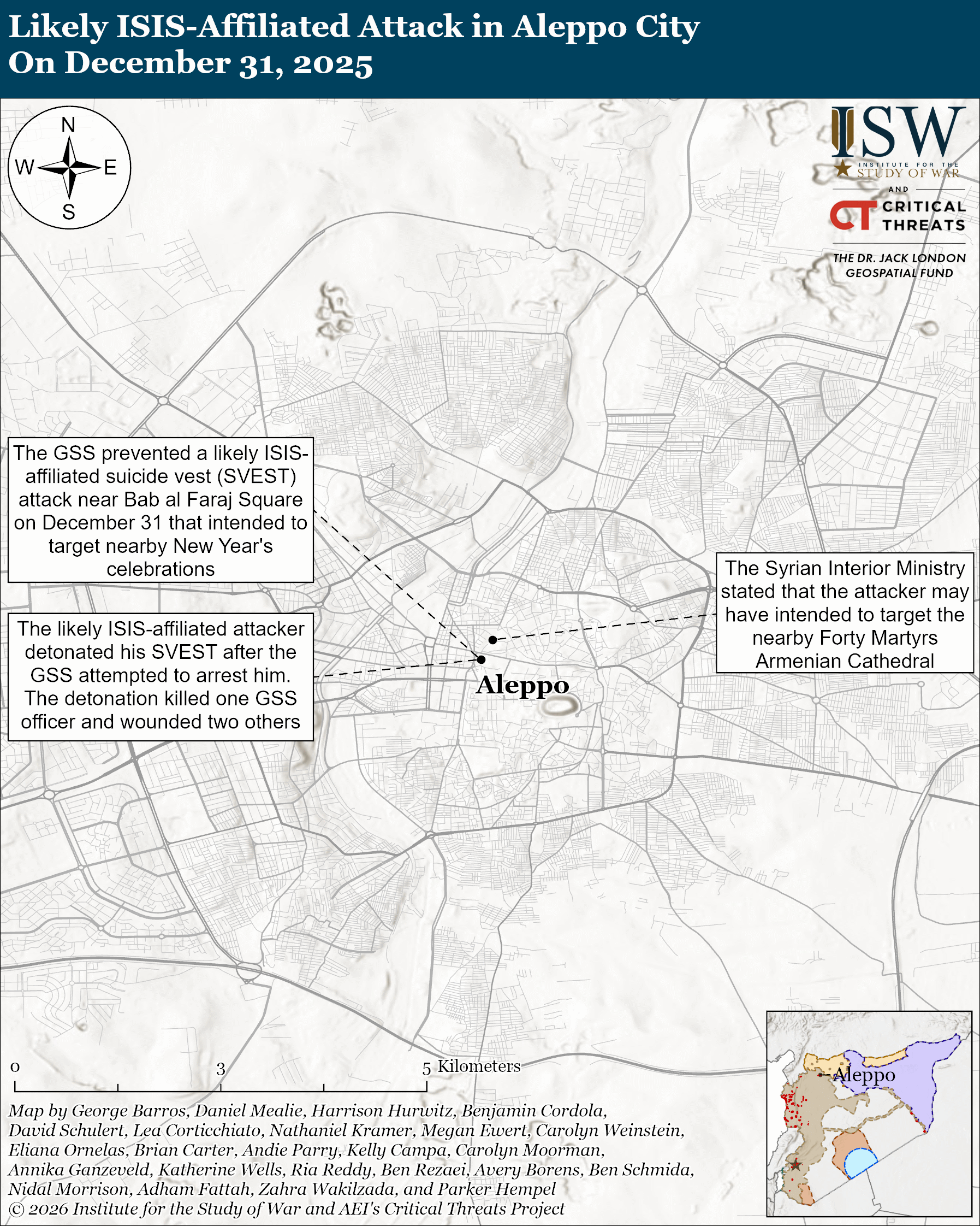 Syrian security forces prevented a likely Islamic State in Iraq and al Sham (ISIS)-affiliated or -inspired suicide vest (SVEST) attack that sought to target New Year’s celebrations and possibly a church in Aleppo City on December 31.[lxxxiv] Local Syrian sources reported that a Syrian General Security Service (GSS) foot patrol identified and attempted to arrest an unspecified attacker near Bab al Faraj Square, Aleppo City.[lxxxv] The attacker fired on the patrol and detonated his SVEST, which killed one GSS officer and wounded two other officers.[lxxxvi] Ministry of Interior (MoI) Spokesperson Noureddine al Baba told Syrian state media on December 31 that the attacker likely intended to target the nearby Armenian Church of Forty Martyrs.[lxxxvii] The MoI announced on January 1 that Syrian intelligence indicated that ISIS sought to attack churches and civilian gatherings during New Year’s celebrations, particularly in Aleppo City, and that the Syrian government deployed increased personnel to the area and near churches.[lxxxviii] Baba added that preliminary information indicated that the attacker may have adhered to ISIS ideology or belonged to an ISIS cell and that the MoI has launched an investigation to determine the attacker's possible affiliation with ISIS.[lxxxix] ISIS has not claimed the thwarted attack at the time of this writing. The December 31 thwarted attack would be the latest Salafi-jihadi attempt to conduct attacks on Syrian minorities since the fall of the regime.[xc] Saraya Ansar al Sunnah, an ISIS-aligned Salafi-jihadi group primarily based in western Syria, previously conducted an improvised explosive device (IED) attack on an Alawite Mosque in Homs City on December 26.[xci] Saraya Ansar al Sunnah also claimed responsibility for a suicide bombing on a church in Rif Dimashq Province in June 2025.[xcii]