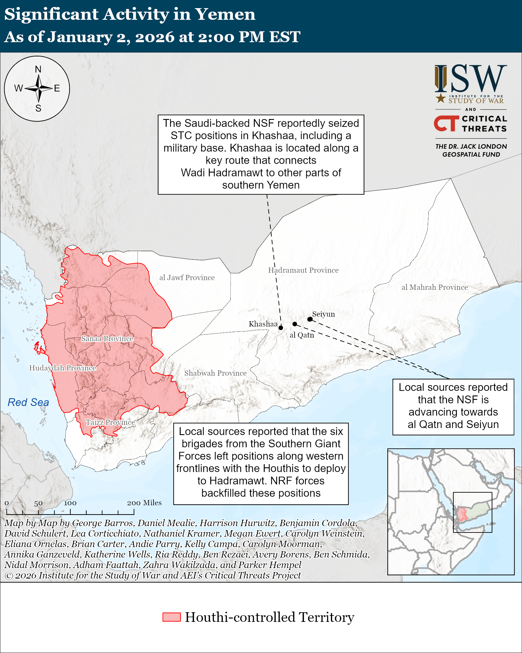 The STC is reportedly redeploying forces from its fronts with the Houthis in western Yemen to reinforce STC positions in Hadramawt Governorate in response to the NSF’s operation. Military sources told Yemeni media on January 1 that six brigades from the STC’s Southern Giant Forces redeployed from positions along the western frontlines with the Houthis to reinforce STC positions in Hadramawt Governorate.[li] The sources said that UAE-backed National Resistance Forces backfilled the Southern Giant Forces’s positions.[lii] The Southern Giant Forces, which is commanded by STC Vice President and PLC Vice President Abu Zaraa al Muharrami, is primarily based in southwestern Yemen and has played a significant role in fighting the Houthis in Shabwa and Marib governorates in central Yemen.[liii] The STC may not be able to continue to backfill positions along Houthi frontlines if the fighting between Saudi-backed forces and the STC increases in eastern Yemen and requires further STC reinforcements to protect the territory that would comprise the State of South Arabia. The Houthis could exploit the conflict between UAE- and Saudi-backed forces for their own territorial gains if the STC continues to redeploy forces from the front lines in western Yemen to Hadramawt and other eastern Yemeni Governorates.
