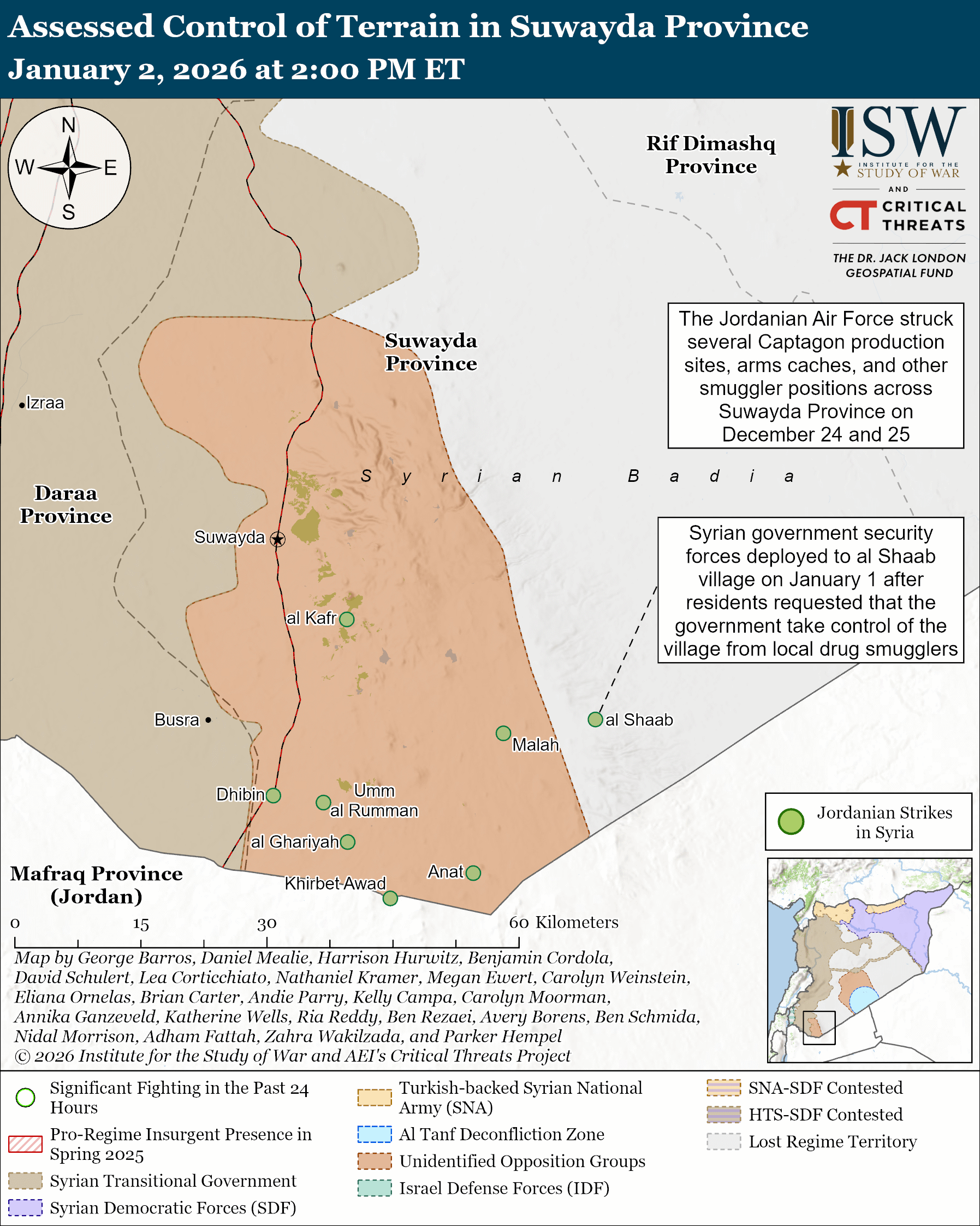 Jordanian airstrikes that targeted Captagon production sites, arms caches, and smuggler positions in Suwayda Province on December 24 and 25 indicate that drug traffickers continue to utilize Assad-era smuggling infrastructure in Suwayda along the Syria-Jordan border. Local Syrian sources reported that the Jordanian military struck at least eight Captagon production sites, arms caches, and smuggler positions across Suwayda Province on December 24 and 25.[xciii] Jordanstruck targets in al Shaab village, which Bedouin drug smugglers belonging to the al Rathman tribe reportedly controlled outside of the authority of the Syrian government and Suwayda National Guard.[xciv] Jordanian airstrikes previously killed an al Rathman tribe Captagon “kingpin” in Suwayda Province in 2023.[xcv] Syrian government Badia (Desert) Security Directorate forces took control of al Shaab on January 1 following the strikes.[xcvi] Local residents requested that government forces remove local drug smugglers and armed gangs who controlled the village.[xcvii]