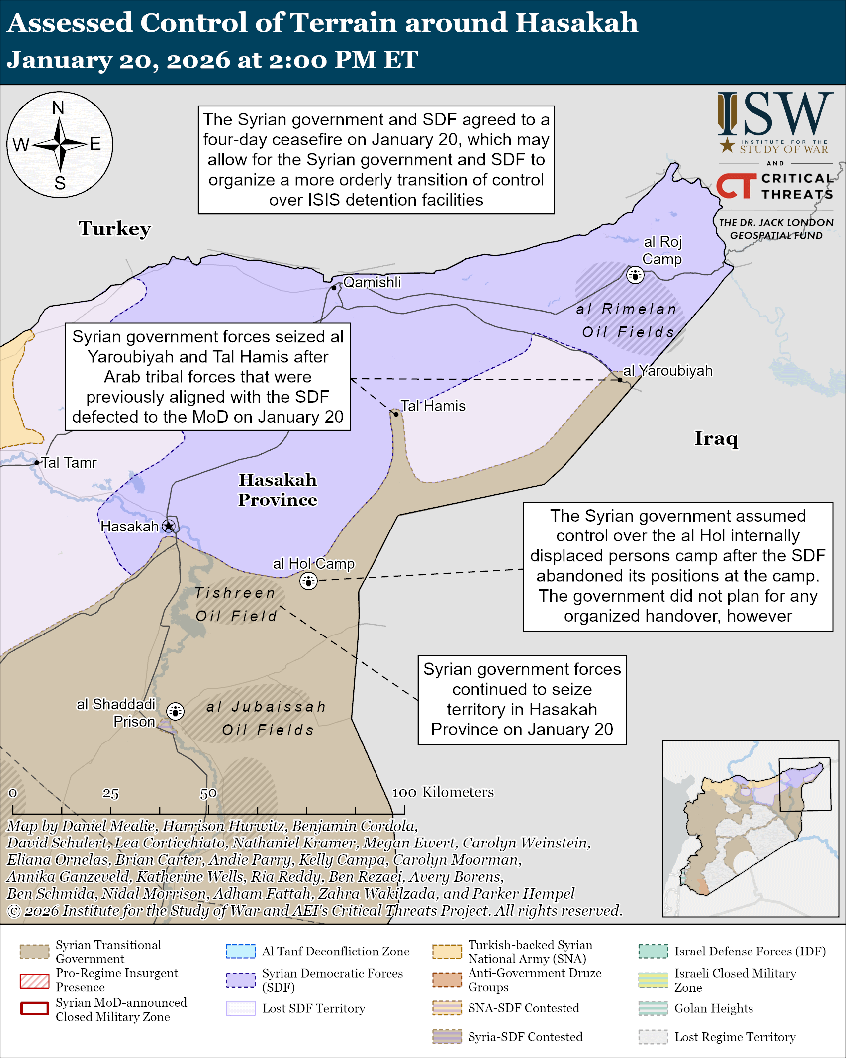 Syrian President Ahmed al Shara likely decided to temporarily halt the Syrian government offensive on Syrian Democratic Forces-held (SDF) territory in northeastern Syria after a phone call with US President Donald Trump on January 19.[i] Shara and SDF Commander Mazloum Abdi failed on January 19 to finalize a ceasefire that both men had agreed to the day prior on January 18, reportedly due to Abdi’s request for five days to consult with other SDF leaders on Shara's demands.[ii] Syrian government forces then advanced toward the remaining SDF-held regions with large Kurdish populations.[iii] Shara and Trump discussed the “protection of the Kurdish people” during their January 19 phone call, according to a Syrian readout of the call.[iv] Shara later provided a major concession to Abdi in a “mutual understanding” on January 20 by granting Abdi four days to consult with SDF leaders and secure their agreement to Shara’s terms, which include the SDF’s integration into the Syrian state and the handover of Hasakah Province to the state.[v] This is a major concession because Shara could have continued his advance and attempted to finish his efforts to destroy the SDF while it was disorganized and militarily vulnerable. The four day pause also provides Abdi an opportunity to prepare defenses if he cannot secure agreement within the SDF to accept the deal (more on preparing defenses below). Shara pledged that the Syrian army will not enter Hasakah City, Qamishli, or Kurdish villages” in the event of an agreement.”[vi] Trump said during a January 20 press conference that his administration is “trying to protect the Kurds” in Syria, further suggesting that his call influenced Shara to enact a brief ceasefire to reduce harm to Kurdish communities.[vii] The Syrian Ministry of Defense (MoD) announced on January 20 a full ceasefire on “all sectors,” and the SDF affirmed its commitment to the agreement.[viii]