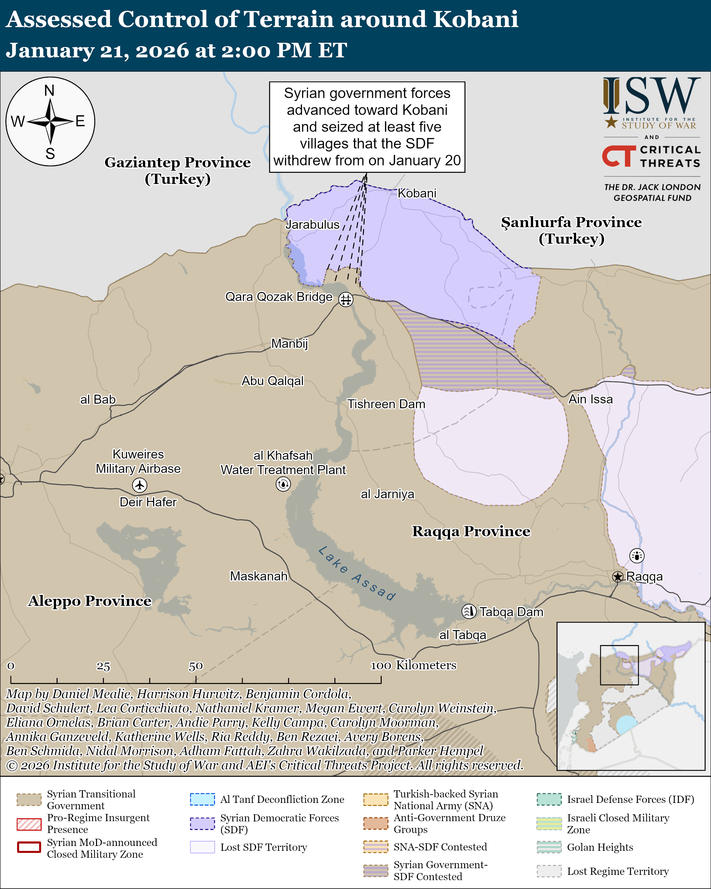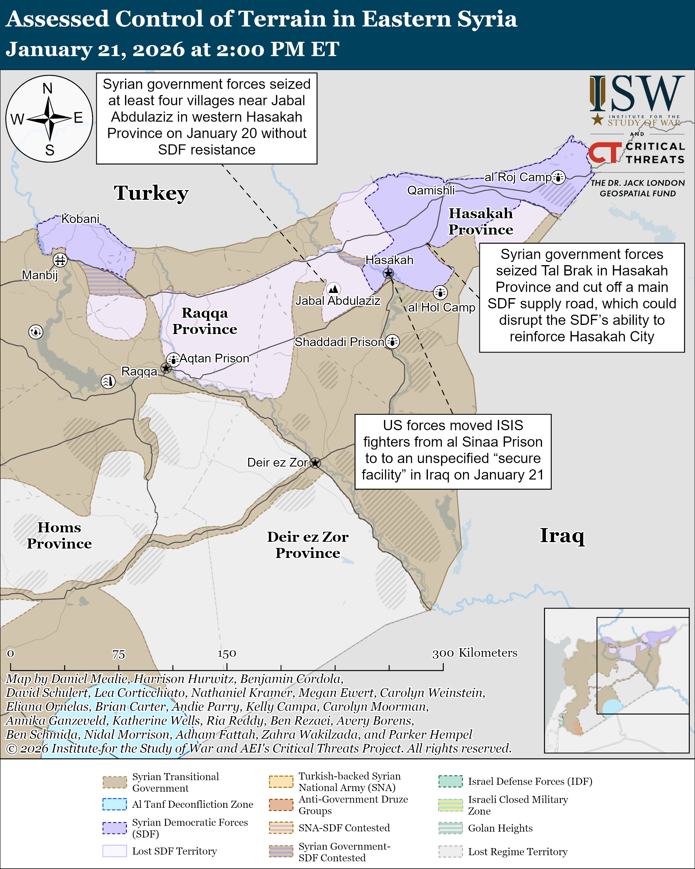 - Syrian Government Offensive in Northeastern Syria: Syrian Ministry of Defense forces continued to advance and consolidate control over positions that the SDF recently abandoned, but also to set future military conditions for renewed offensive operations if the current ceasefire fails.
