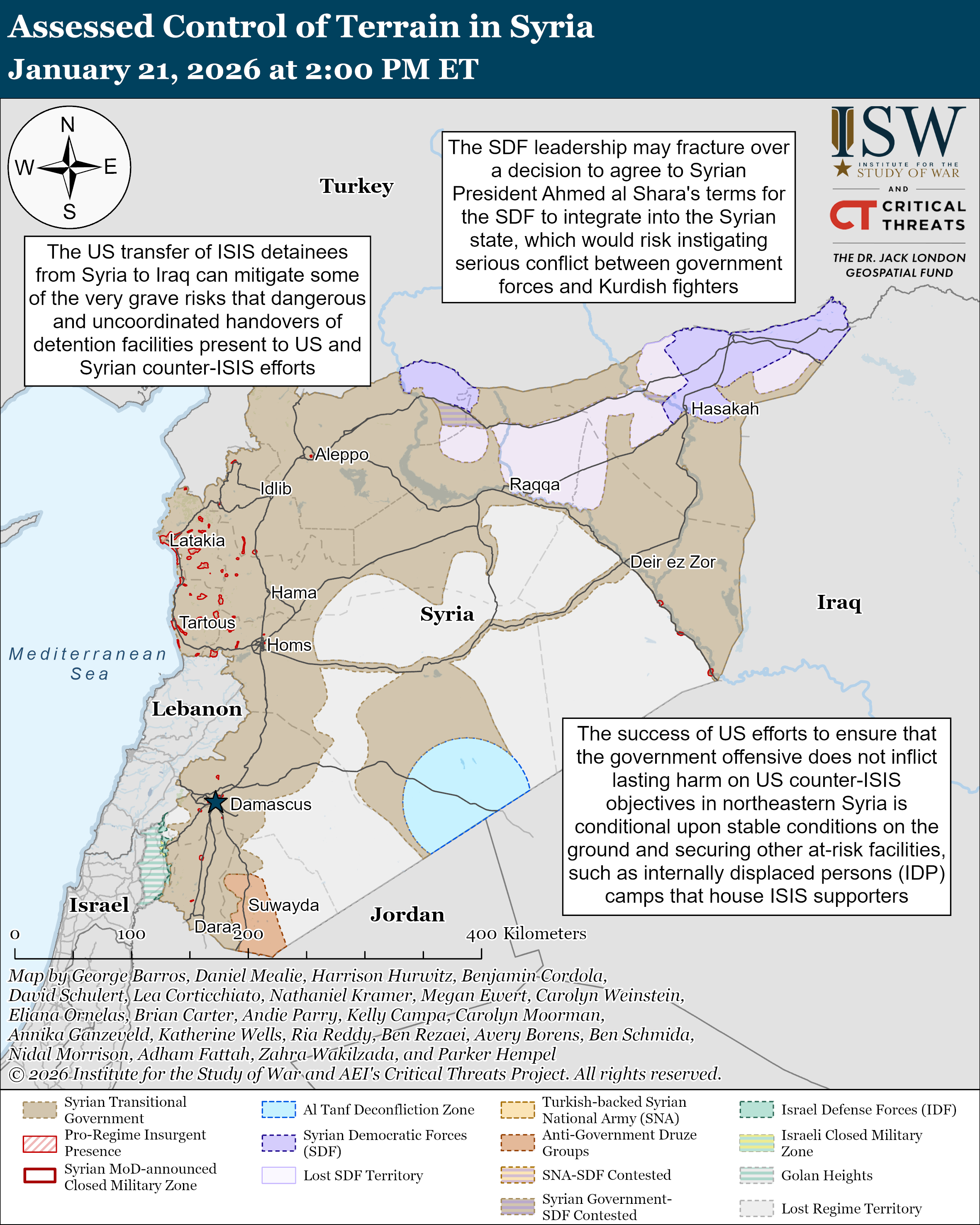 Syria Mapping Note: CTP-ISW recoded all data under the Turkish-backed Syrian National Army layer as the Syrian Transitional Government layer. We also recoded all data under the SNA-SDF Contested layer as Syrian Government-SDF Contested. The coalition of pro-Turkish Syrian opposition militias known as the Syrian National Army (SNA) has largely been incorporated into Syrian state entities and Syrian security services as of January 26, 2026. The Turkey-based Syrian Interim Government and its military force, the SNA, formally dissolved into the Syrian transitional government in January 2025.[xv]