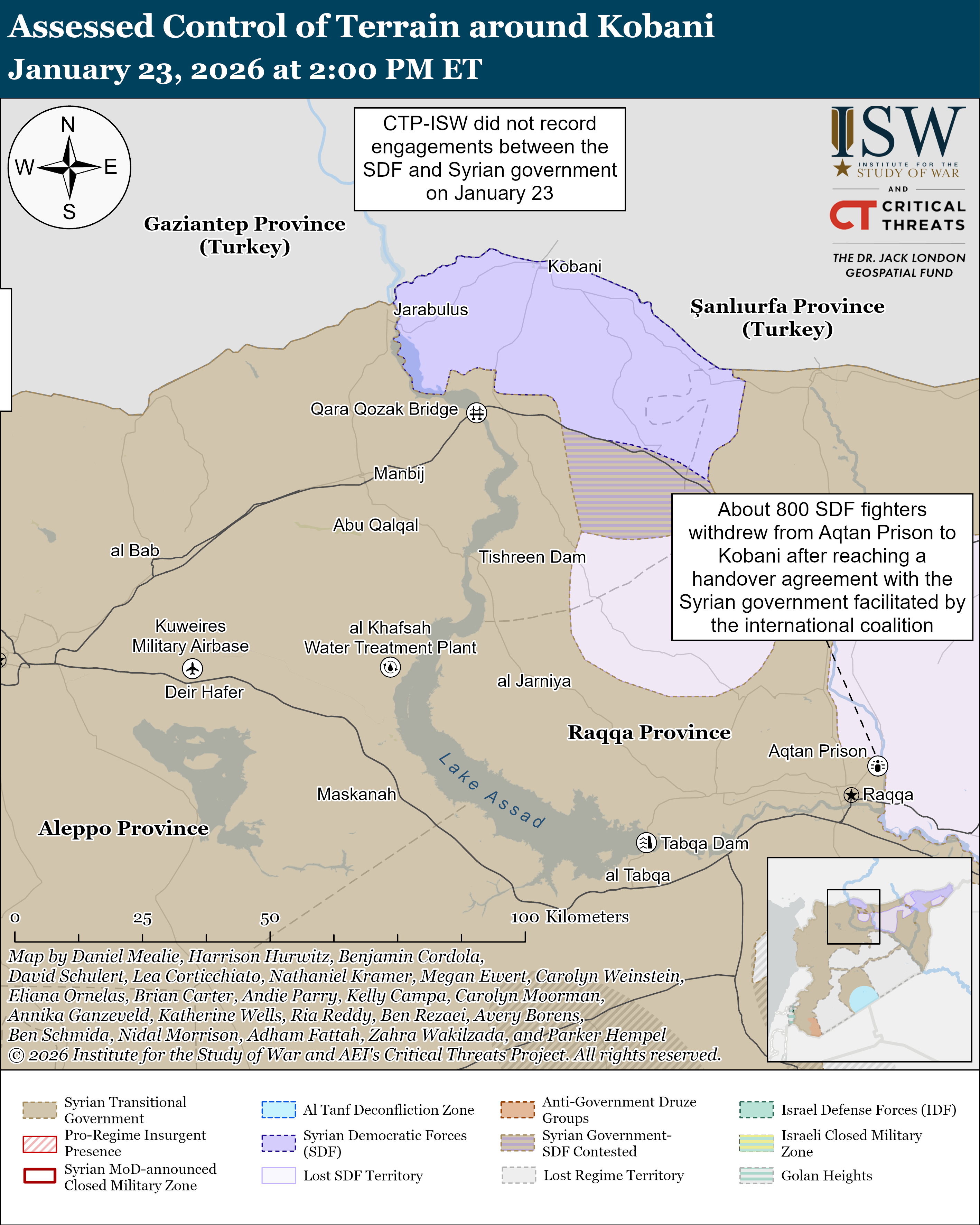The Syrian government and the Syrian Democratic Forces (SDF) may agree to extend the US-mediated ceasefire, according to Kurdish sources and mediators. The Syrian government and SDF agreed to a ceasefire on January 20 that gave SDF Commander Mazloum Abdi four days to secure other SDF leaders’ agreement to Syrian President Ahmed al Shara’s terms, which include the integration of the SDF and its remaining territory into the Syrian state.[i] Abdi has around 24 hours remaining, as of the time of this writing, to “develop a detailed plan” to integrate the SDF and its territory into the Syrian state. Unspecified Kurdish political sources affiliated with the SDF and the Iraqi Kurdistan Regional Government (KRG) told Qatari-owned, UK-based media on January 23 that Abdi and US Ambassador to Turkey and Special Envoy to Syria Tom Barrack reached an “understanding” to extend the ceasefire between Syrian government forces and the SDF.[ii] Barrack and Abdi met in Erbil, Iraq, on January 22.[iii] The sources said that Barrack and Abdi gave “mutual assurances” that there will be “no return to war.”[iv] A spokesperson for KRG President Nechirvan Barzani, who facilitated the January 22 meeting, told Kurdish media on January 22 that Barzani has urged US mediators and Syrian officials to extend the truce and warned that a short ceasefire of “two to four days” is “insufficient” to resolve the conflict.[v] Abdi and Autonomous Administration of North and East Syria Foreign Affairs Co-Chair Ilham Ahmed support the ceasefire extension, according to Barzani’s spokesperson.[vi] Turkish Foreign Minister Hakan Fidan told Turkish media on January 23 that extending the ceasefire “may be considered” given that the US transfer of Islamic State in Iraq and al Sham (ISIS) detainees from Syria to Iraq is still underway, suggesting that Ankara could also support an extension.[vii]