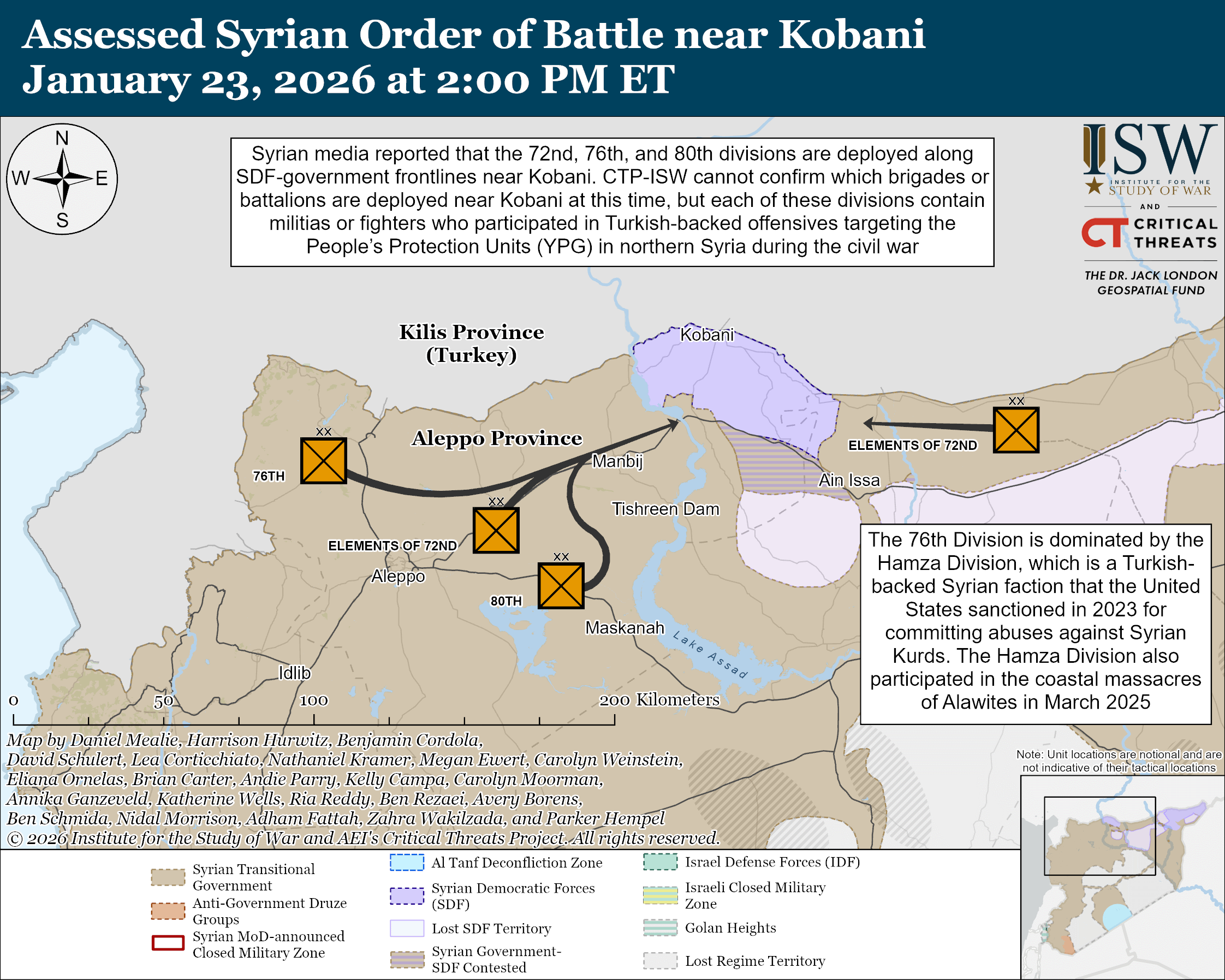 - The 72nd Division is reportedly operating near Sarrin, south of Kobani.[xxxv] Likely former Hayat Tahrir al Sham (HTS) commander Brigadier General Aqil Mohammad al Amer commands the division, but it is unclear which 72nd Division units are present near Kobani.[xxxvi] The 72nd Division contains elements from several SNA militias that participated in Turkish-backed offensives targeting Kurdish fighters in northern Syria, including the Sultan Murad Division and Sultan Mehmed Fatih Division.[xxxvii] The Sultan Murad Division committed human rights abuses against Kurdish civilians and detainees throughout the civil war, and the European Union recently sanctioned the Sultan Murad Division in May 2025 for its involvement in human rights abuses on the Syrian coast in March 2025.[xxxviii] The 72nd Division reportedly secured the Sarrin Airport, south of Kobani, on January 23, possibly after deploying to the area from its positions near Tal Abyad, which is in the former SNA-controlled Peace Spring region.[xxxix] Assistant Defense Minister Fahim Issa visited 72nd Division units in the Peace Spring region on December 23 to discuss ”military readiness” and may have discussed coordination for an army offensive against SDF-held territory.[xl]