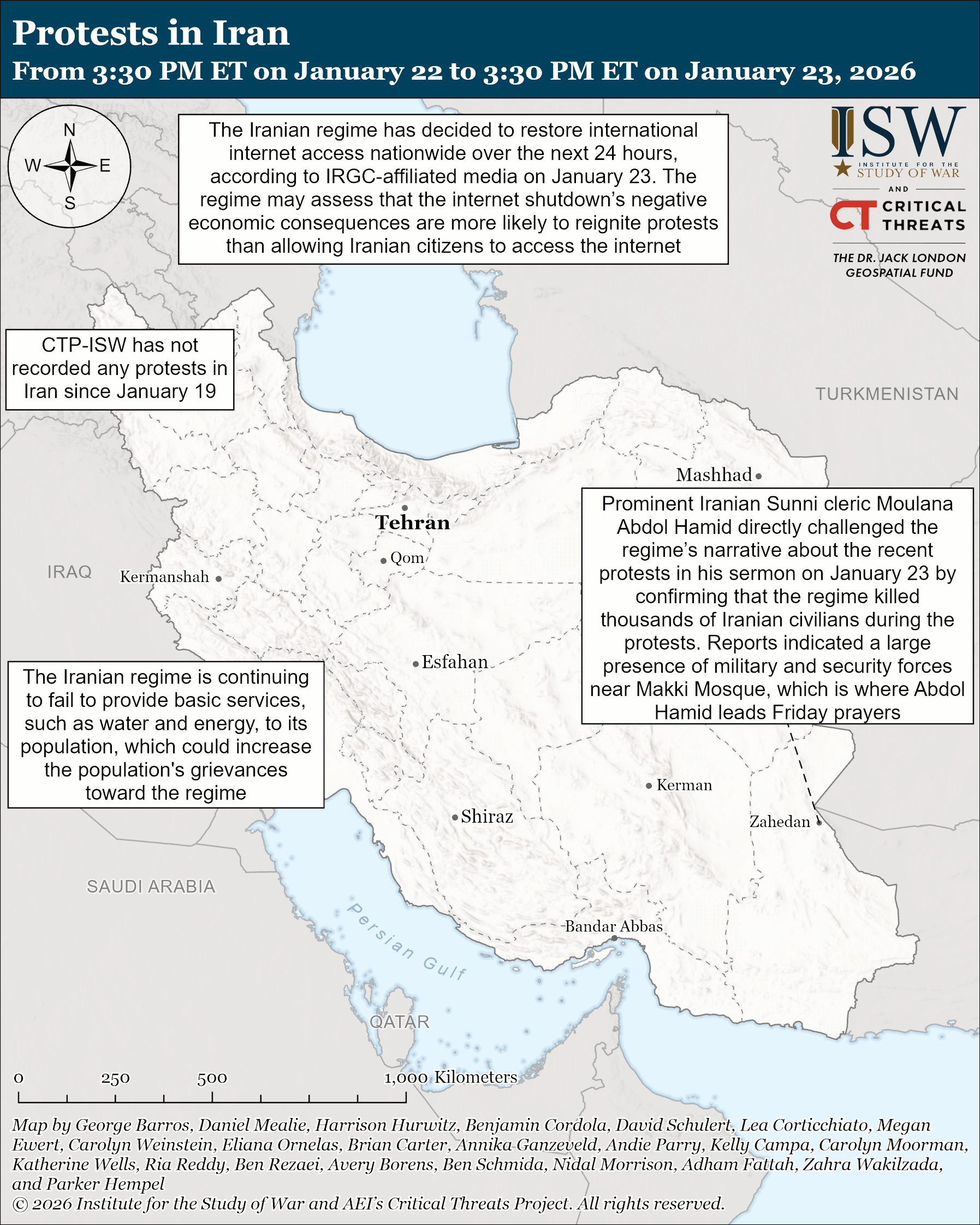 - Internet Shutdown in Iran: The Iranian regime has decided to restore international internet access nationwide over the next 24 hours, according to Islamic Revolutionary Guards Corps (IRGC)-affiliated media on January 23. The regime may assess that the internet shutdown’s negative economic consequences are more likely to reignite protests than allowing Iranian citizens to access the internet. It remains unclear whether the regime will restore international internet access to the whole population, however.