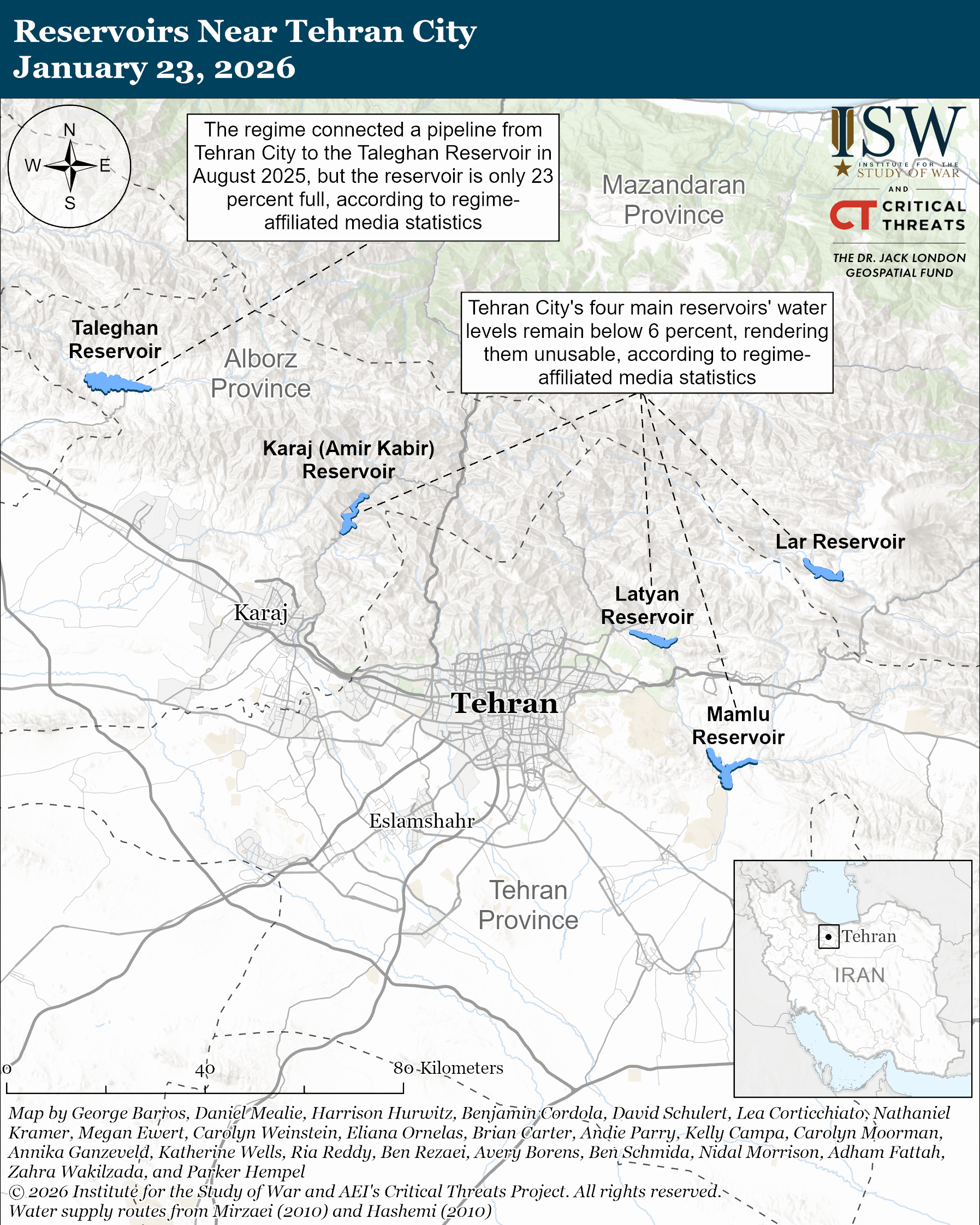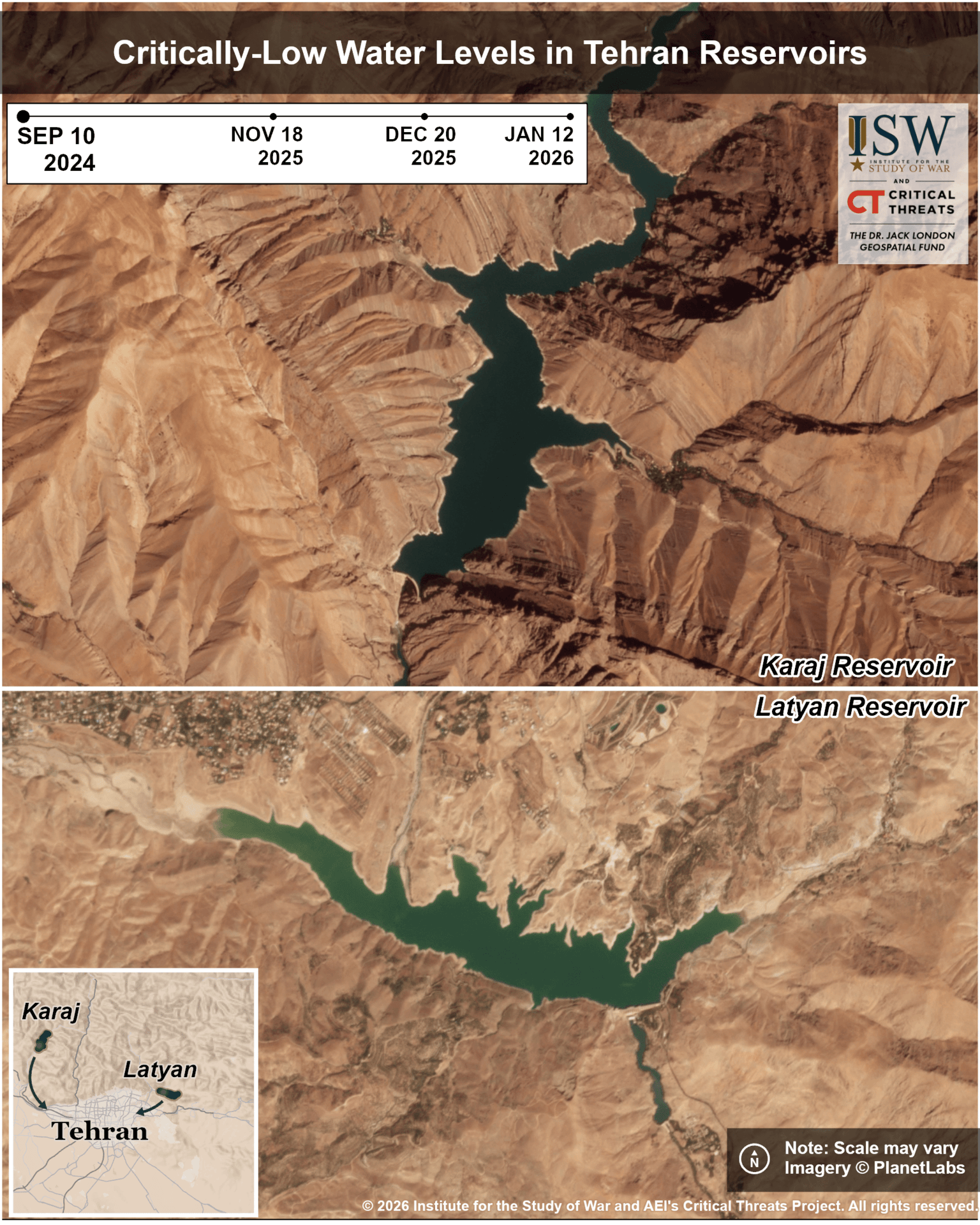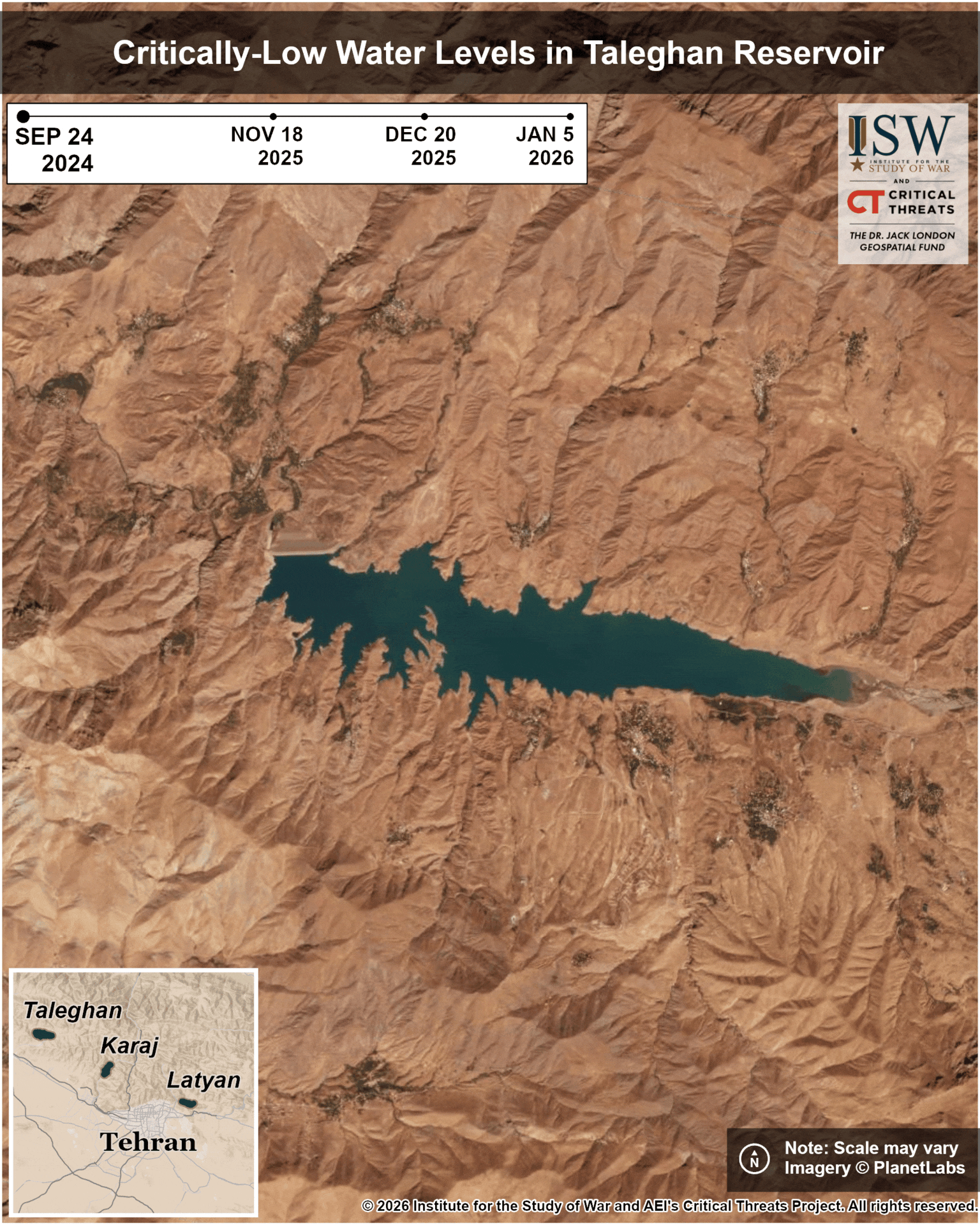 The regime has also failed to address ongoing water shortages. Reservoirs across Iran are, on average, 35 percent full.[lxx] Iran’s water crisis is particularly acute in Tehran, where four of the reservoirs that provide water to the city are six percent full and therefore unusable..[lxxi] Commercially available satellite imagery between September 2024 and January 2026 corroborates Iranian media reports about decreasing water levels at the Karaj and Latyan reservoirs near Tehran City.[lxxii] The regime attempted to source more water in August 2025 by connecting eastern Tehran City to the Taleghan Reservoir in Alborz Province via a pipeline.[lxxiii] The Taleghan Reservoir’s water levels remain low too, however. Regime-affiliated media reported on January 23 that the reservoir’s water levels have decreased by 56 percent since 2024 and is only 23 percent full.[lxxiv] The only solution that regime officials have provided for the water crisis in Tehran City has been to evacuate residents to another location. Evacuating Tehran’s almost 15 million residents would be a tremendous undertaking and would require the regime to have a place to send citizens that has water, energy, and other basic necessities. The regime has neither stated where it would send Tehran residents nor presented a plan or made visible preparations to evacuate the city. The regime’s continued failure to address the energy and water crises sets Iran on a trajectory toward a possible humanitarian crisis and further popular unrest.