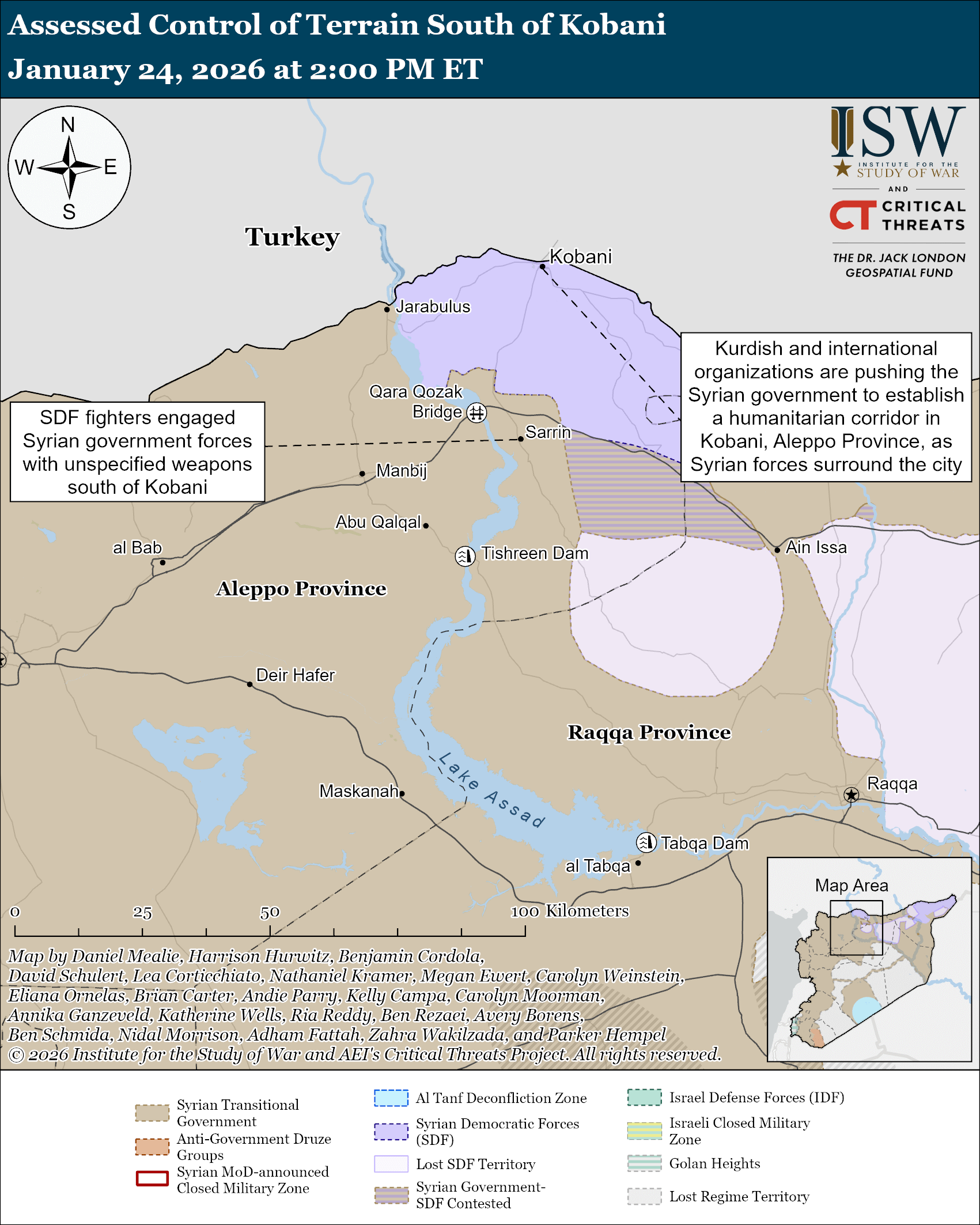 Kurdish and international organizations are pushing the Syrian government to establish a humanitarian corridor in Kobani, Aleppo Province, as Syrian forces surround the city. The Kurdish National Council (ENKS) and the Autonomous Administration of North and East Syria (AANES) called on January 24 for the opening of a humanitarian corridor in Kobani to enable civilians to access aid, medical treatment, and basic necessities.[xiv] The ENKS stated that it is in contact with the Syrian government and every “party responsible” to open a corridor.[xv] The deputy spokesperson for the UN Secretary General also noted on January 24 that the United Nations is in contact with Syrian authorities to deliver aid to Kobani.[xvi] Civilians in Kobani have no access to electricity, water, essential food supplies, or internet.[xvii] CTP-ISW noted on January 22 that it is unclear whether SDF shelling caused electricity and water infrastructure to fail or if the government deliberately cut Kobani’s access to those resources.[xviii] The Syrian army announced on January 24 that it will open humanitarian corridors in “the coming hours,” but did not specify if this includes a corridor in Kobani.[xix] Syrian government forces have surrounded SDF fighters in Kobani since January 19, likely as the first part of a multi-stage operation to reduce SDF forces there.[xx] The pattern of events and government deployments around Kobani resembles recent government isolate-and-reduce operations against the SDF in Aleppo City and Deir Hafer, which suggests the Syrian military will employ a similar concept of operations in Kobani.[xxi] This would include opening an evacuation route to enable civilians to leave Kobani before launching an assault on the city.[xxii]