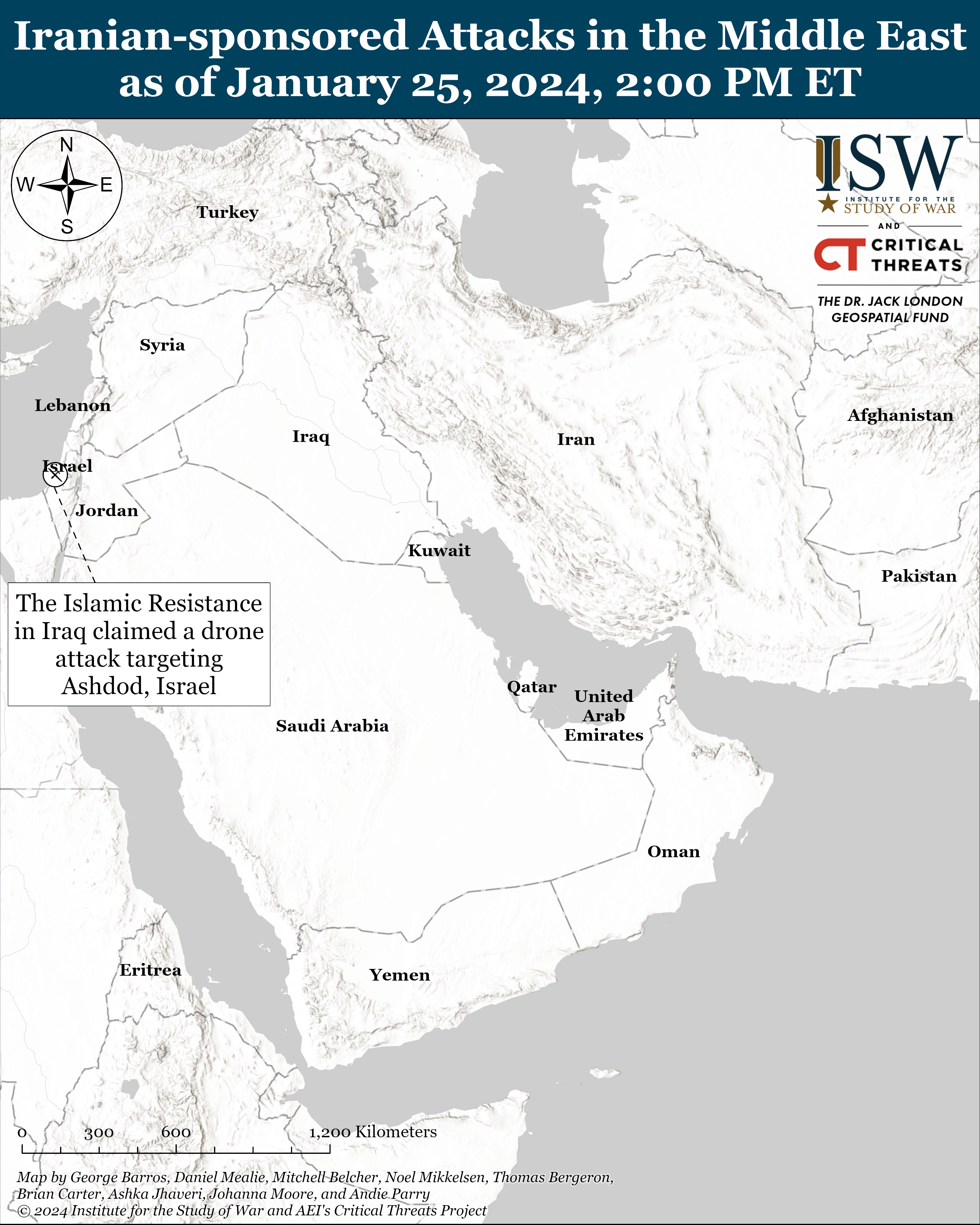Iranian-backed militias, including Lebanese Hezbollah, conducted four attacks from southern Lebanon into northern Israel on January 25.[liii] Hezbollah launched two one-way attack drones at Israeli Iron Dome air defense batteries in Kfar Blum.[liv] Hezbollah has only claimed one other attack on Iron Dome batteries during the Israel-Hamas war.[lv] Hezbollah drone attacks into Israel are relatively rare, as the group more commonly uses anti-tank munitions in its regular attacks on Israeli targets.