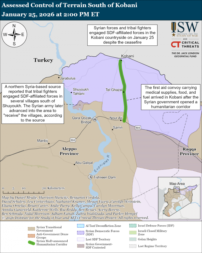 The extension of the Syrian government-Syrian Democratic Forces (SDF) ceasefire is enabling the government to deliver humanitarian aid to SDF-controlled areas in northern Syria. The Syrian army established two humanitarian corridors in Kobani and Hasakah City to enable civilians to access aid, medical treatment, and basic necessities.[xx] The first humanitarian aid convoy carrying medical supplies, food, and fuel arrived in Kobani on January 25.[xxi] The supply of aid is particularly necessary for residents and internally displaced persons in Kobani because the city has not had access to electricity, water, essential food supplies, or internet since at least January 20.[xxii] CTP-ISW noted on January 22 that it is unclear whether SDF shelling caused electricity and water infrastructure in Kobani to fail or if the government deliberately cut the city's access to those resources.[xxiii] Syrian government forces are positioned on the outskirts of Kobani and Hasakah at the time of this writing but are not allowed to enter either city under the ceasefire agreement, which the Syrian government and SDF extended on January 24.[xxiv] The Interior Ministry’s A1 Special Missions Unit deployed to secure the Kobani corridor near the M4 highway on January 25.[xxv]