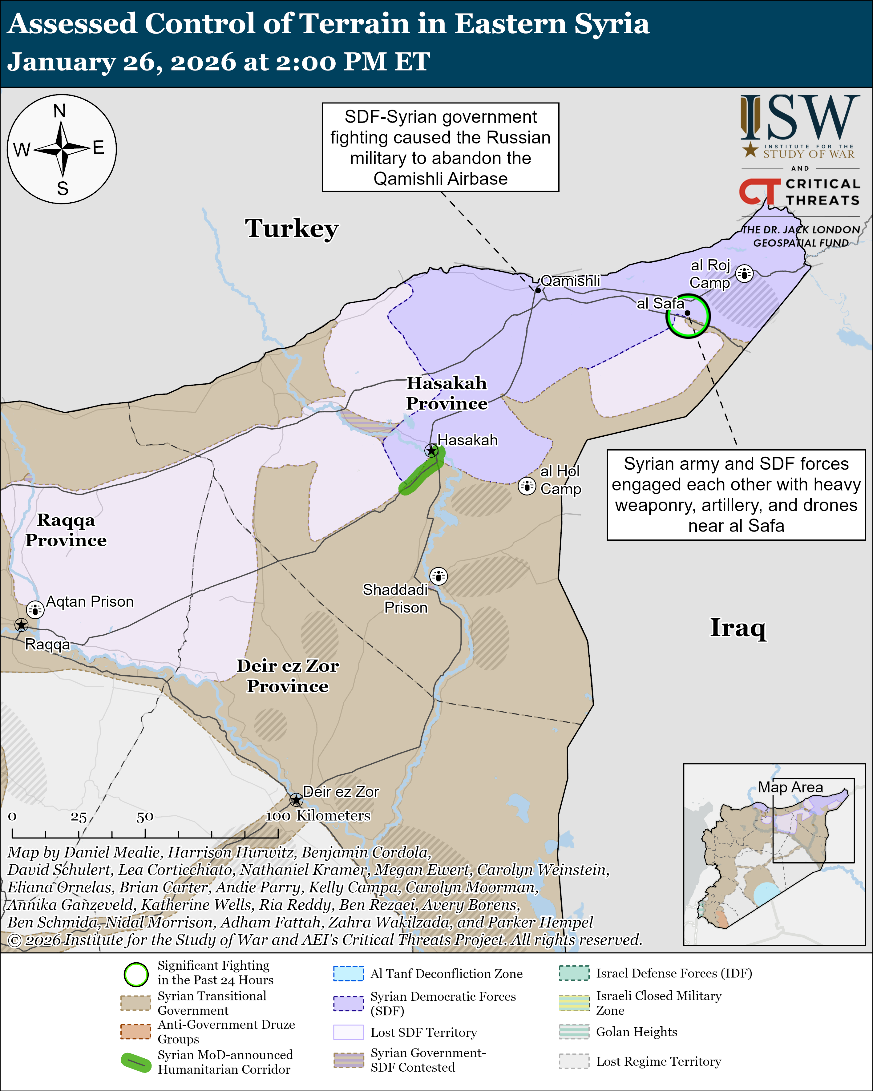 - Syrian Government-SDF Conflict: Fighting between the Syrian army and the Syrian Democratic Forces (SDF) continued on January 26 but did not collapse the January 20 ceasefire or disrupt ongoing US transfers of ISIS detainees from Syria to Iraq. The Syrian government and the SDF have made some progress on integration negotiations during the ceasefire.