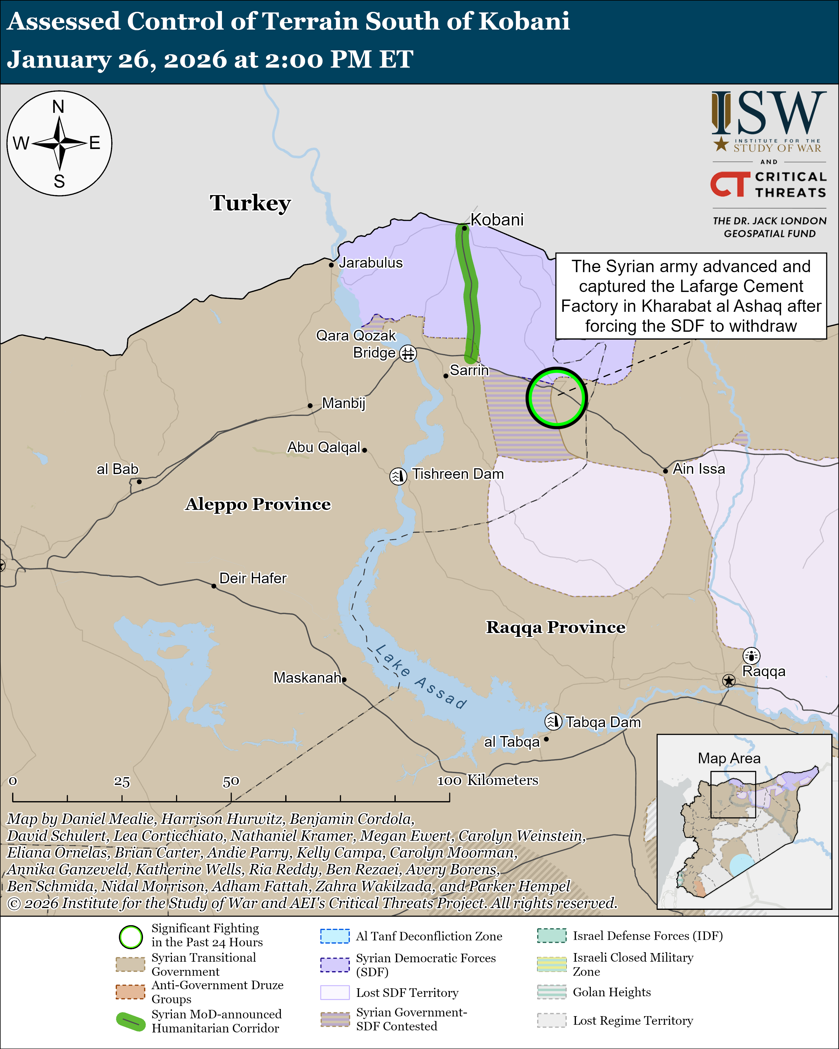 Fighting between the Syrian army and the Syrian Democratic Forces (SDF) continued on January 26 but did not collapse the January 20 ceasefire or disrupt ongoing US transfers of ISIS detainees from Syria to Iraq. The Syrian government and the SDF agreed on January 20 to a four-day ceasefire, which they extended by 15 days on January 24.[lvii] The Syrian army and the SDF have continued to engage each other along frontlines in the Kobani and Qamishli countrysides since agreeing to the ceasefire.[lviii] The Syrian army engaged SDF forces in Jabaliyah and Kharabat al Ashaq, Aleppo Province, along the Kobani axis, on January 25 and 26, before advancing and capturing the nearby Lafarge Cement Factory on January 26.[lix] The Lafarge Cement Factory has several tall buildings and structures that provide the Syrian army with clear lines of sight to nearby SDF positions, particularly along the M4 highway.[lx] The Syrian army and SDF forces also engaged each other with heavy weaponry, artillery, and drones near al Safa, Hasakah Province, on the Qamishli axis on January 26.[lxi] Pro-SDF and pro-government sources reported that Turkish drones conducted reconnaissance and struck al Safa on January 26.[lxii] The Syrian army and the SDF did not engage in clashes near Hasakah City and the fighting along the Kobani and Qamishli axes did not disrupt US efforts to transfer ISIS detainees from Syria to Iraq.[lxiii]